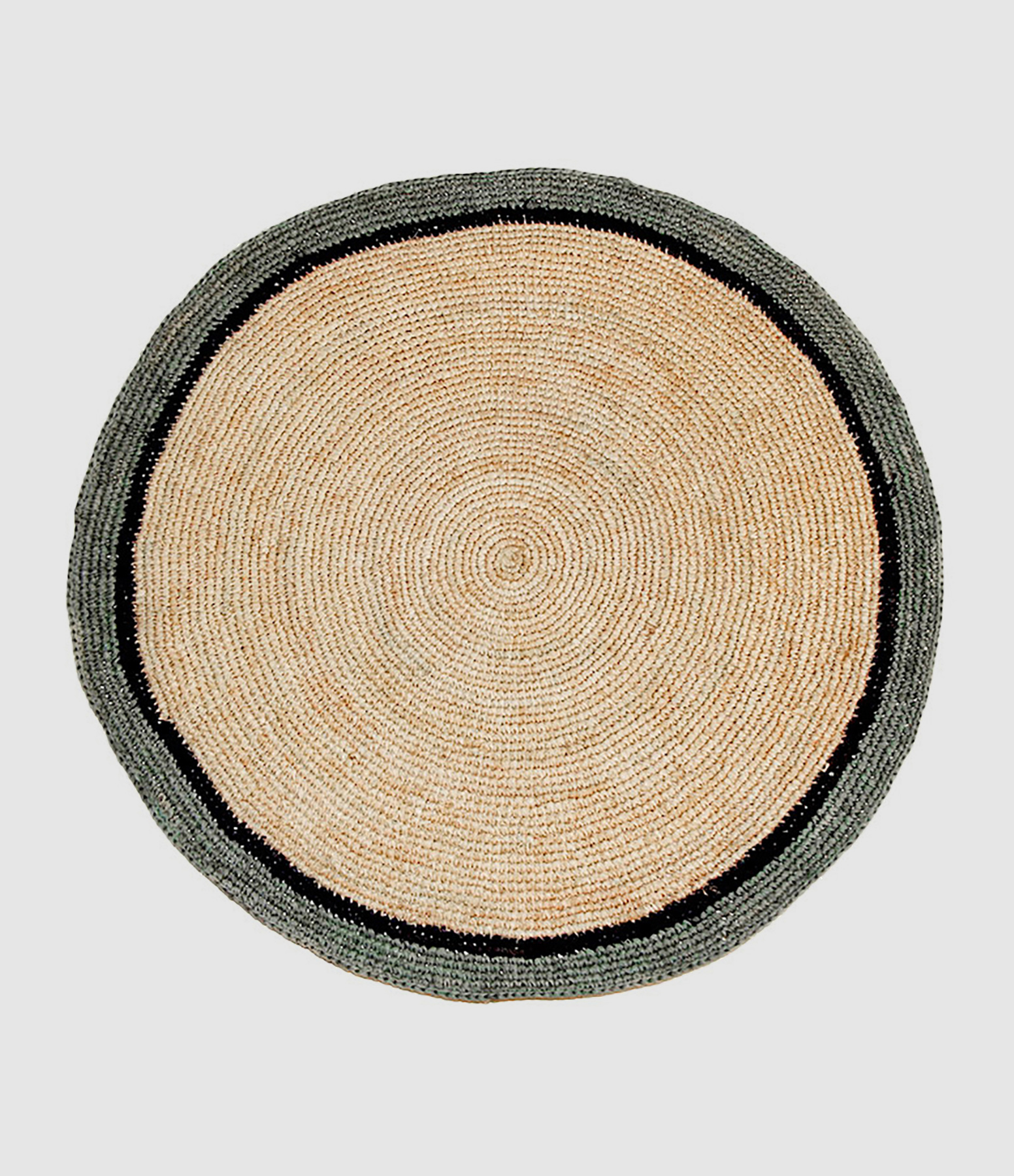 Set de table rond en raphia naturel noué à la main, avec bordure bleue et noire.