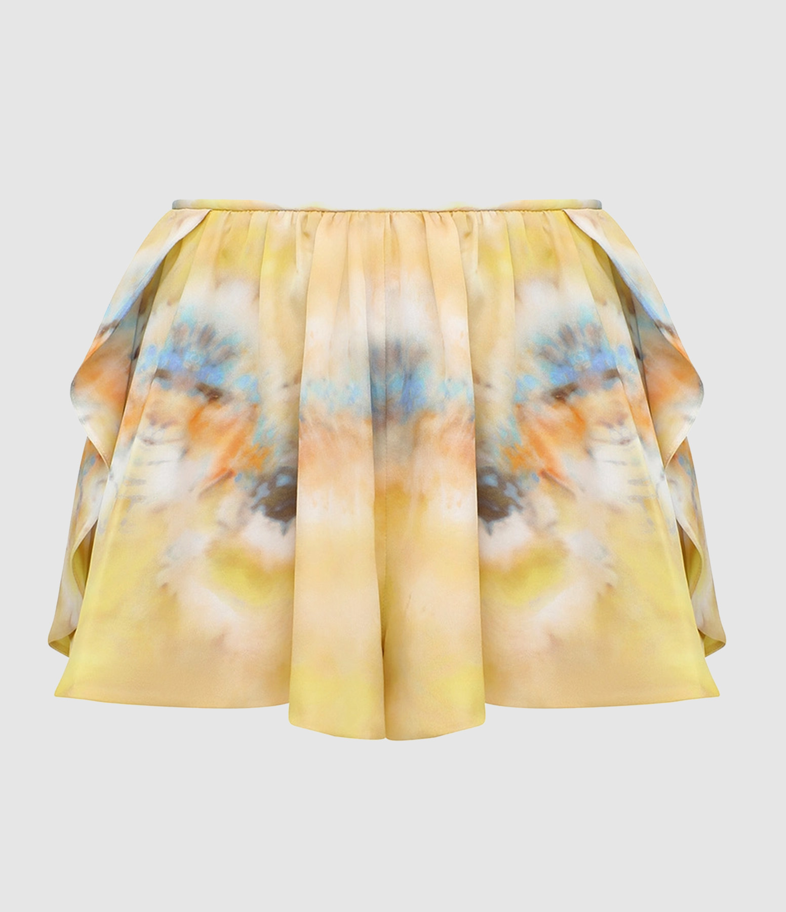 Mini-short en tie-dye jaune. Confectionné en sergé de soie et de coton, il présente une taille basse avec des fronces, une longueur mini, une fermeture éclair invisible au dos et un ourlet asymétrique.