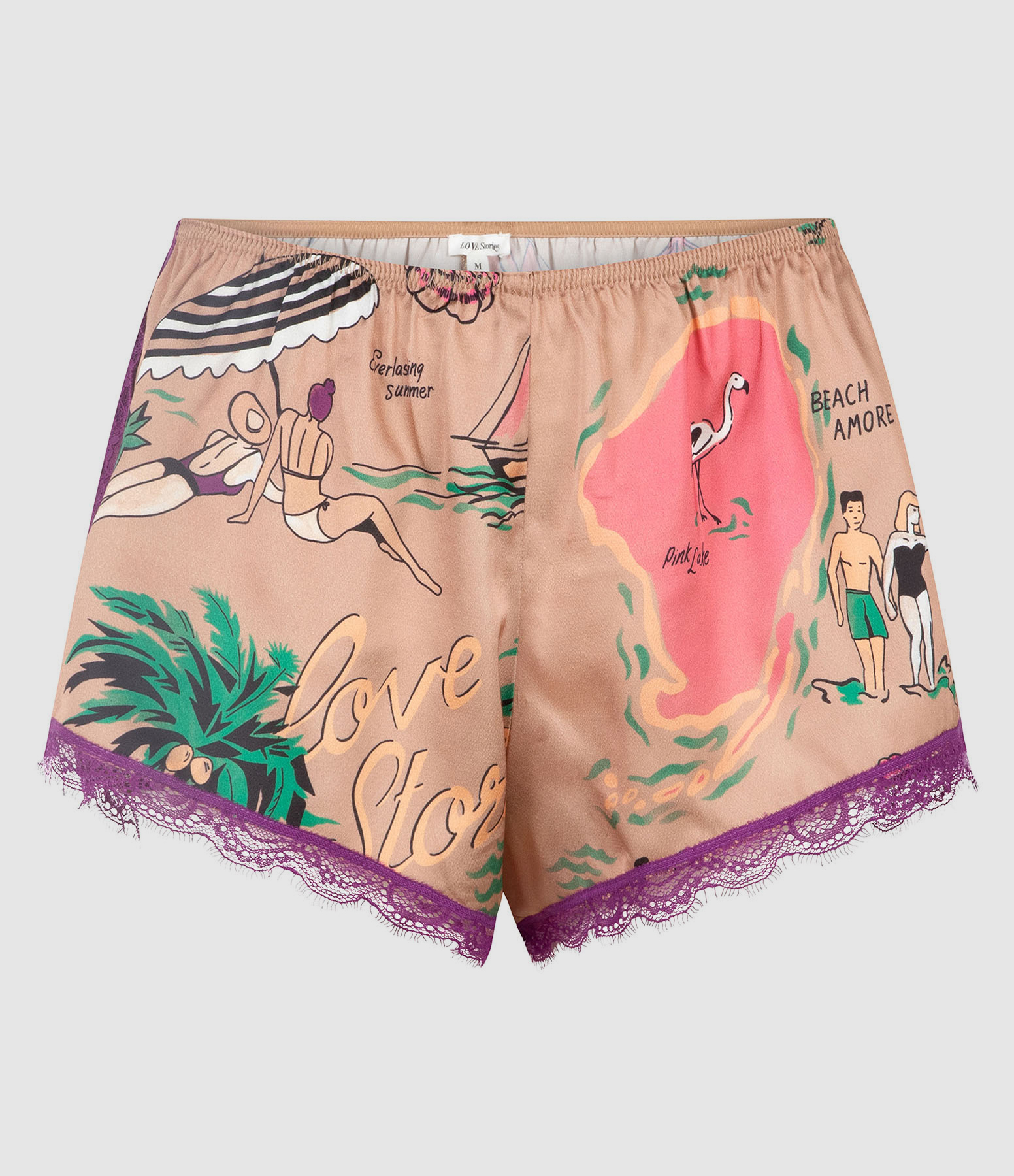 Short de pyjama à imprimé multicolore. Taille élastiquée. Bords en dentelle.
