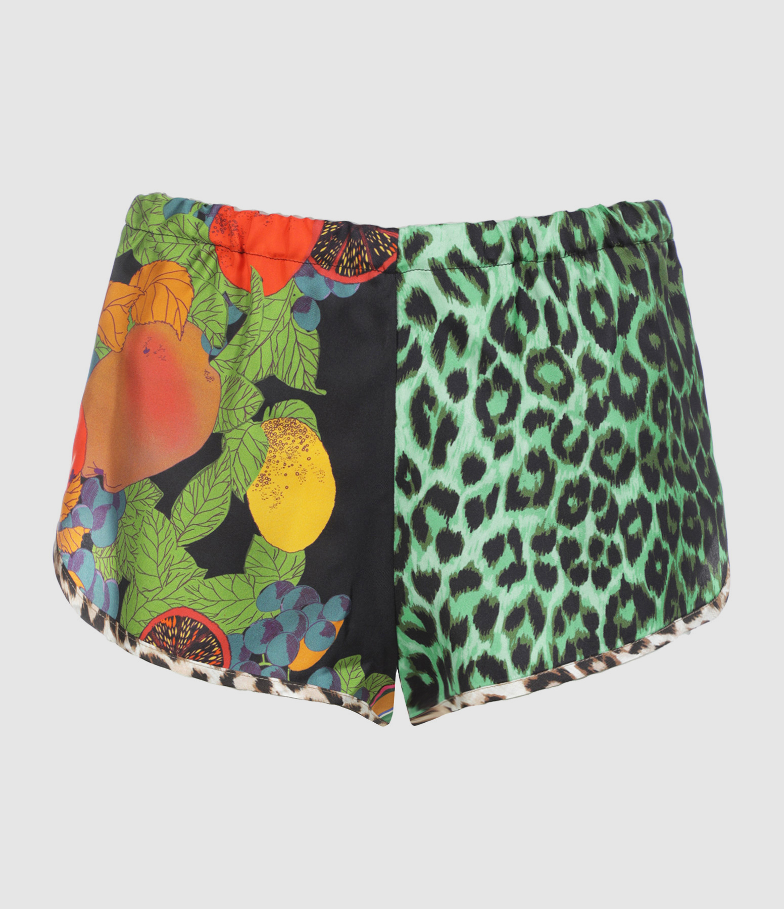 Mini short fluide en soie imprimée. Effet patchwork. Taille élastiquée. Coupe échancrée.