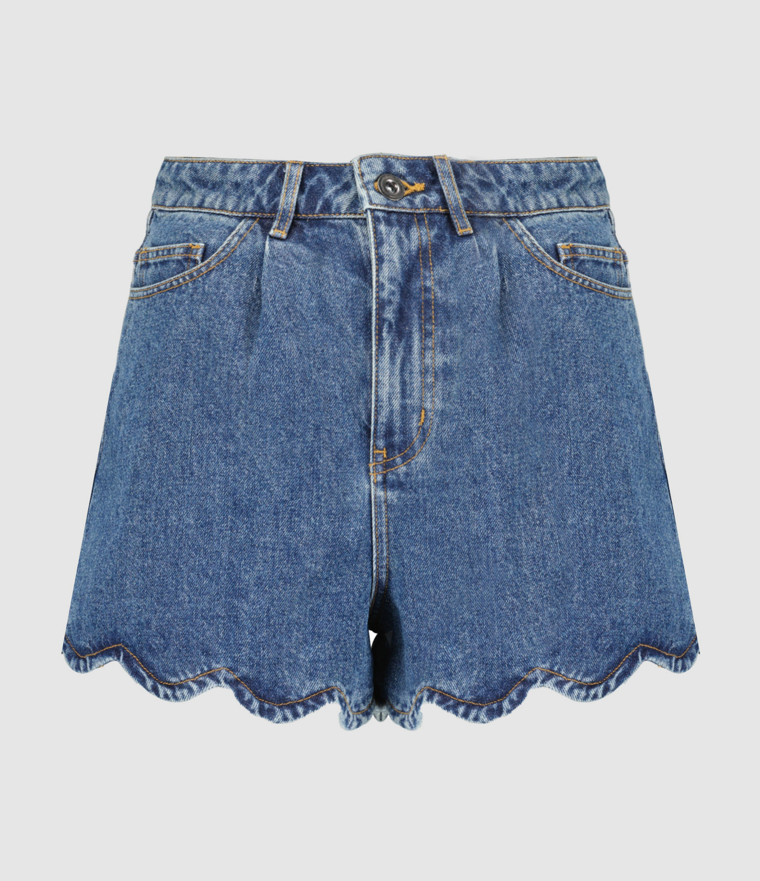 Short en denim de coton bleu. Cinq poches. Braguette zippée et boutonnée. Taille haute avec passants pour ceinture. Bas de jambe ondulé.
