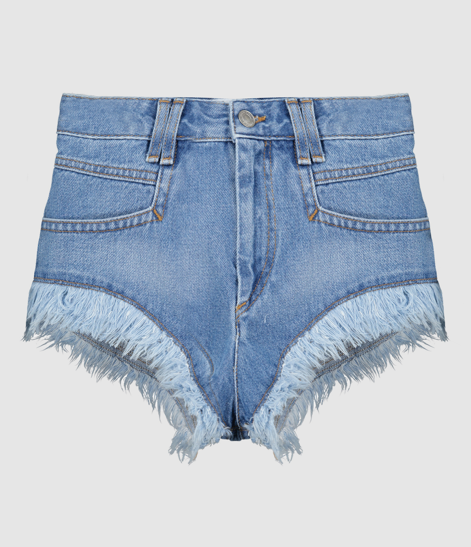 Mini short en denim bleu à franges. Fermeture par zip et bouton. Passants pour ceinture. Quatre poches dont deux poches plaquées à l'arrière. Coupe échancrée.