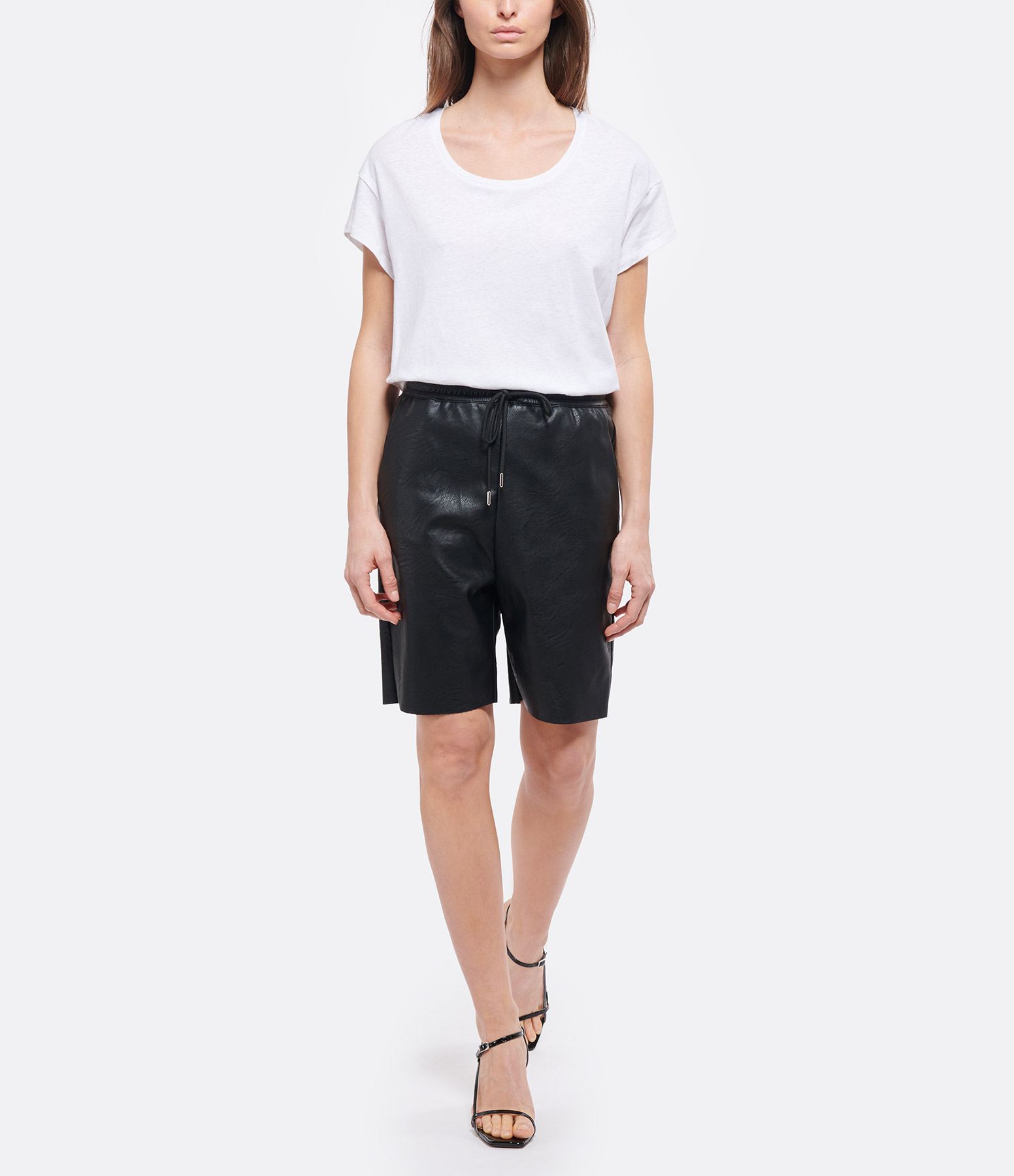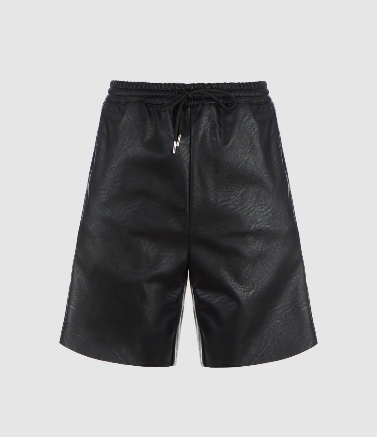 Bermuda en similicuir noir, style bermuda. Taille haute élastiquée avec liens de serrage. Deux poches italiennes. Coupe loose.