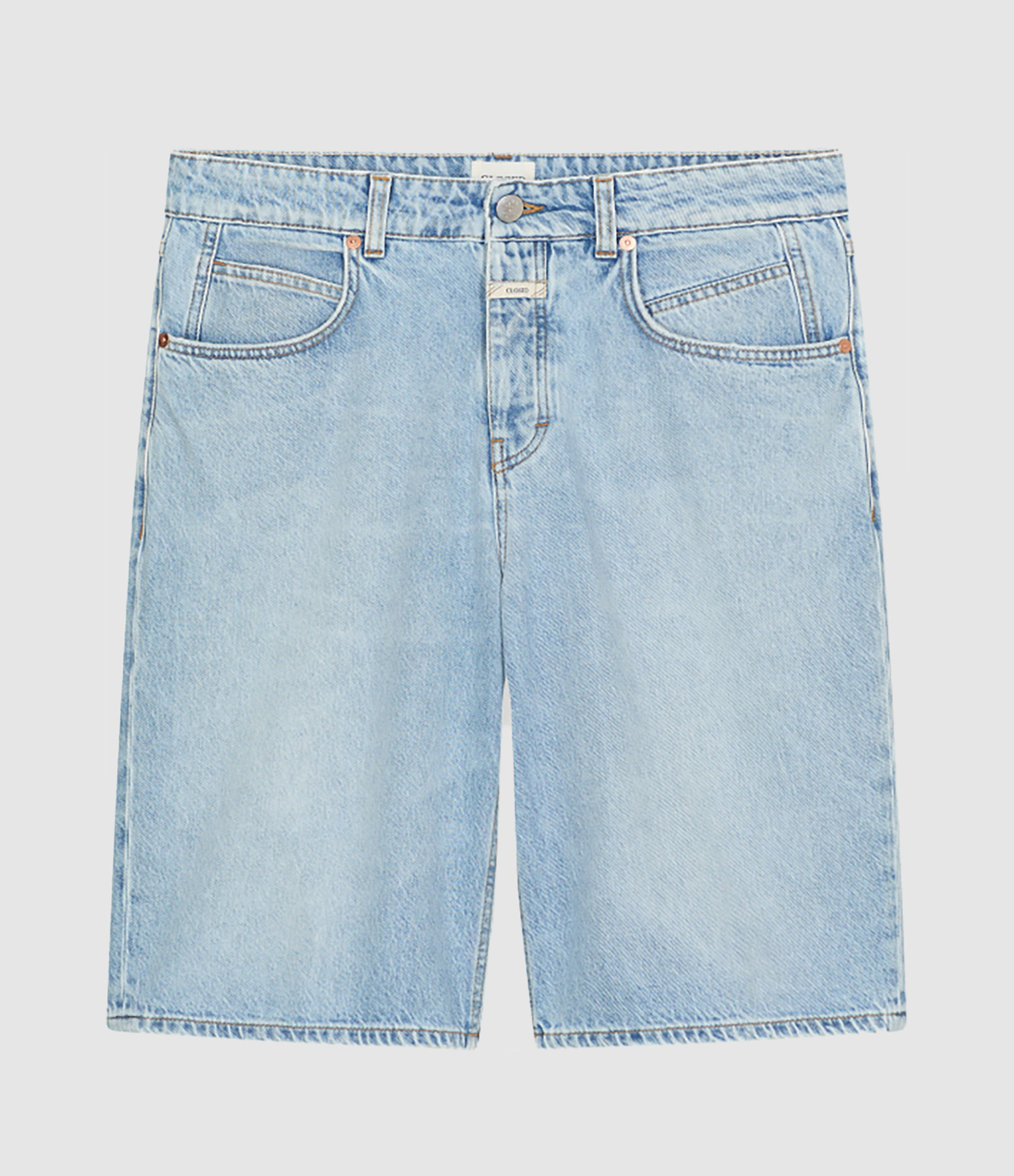Short mi-long bleu clair. Doté de cinq poche et d'une braguette à boutons cachés.