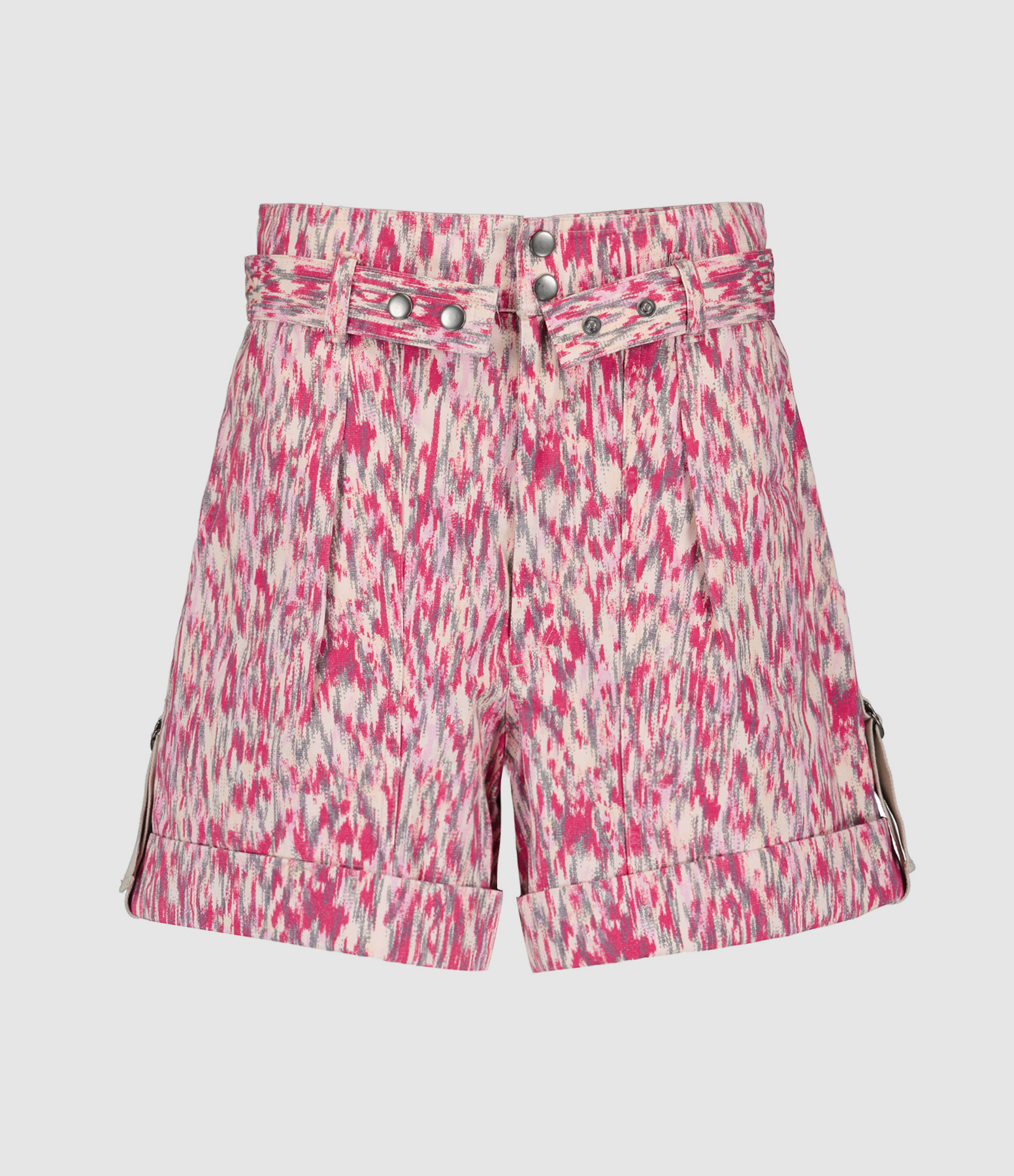 Short en coton imprimé dans des tons framboise. Taille haute avec ceinture amovible. Passants pour ceinture. Braguette zippée et pressionnée. Boutons pressions en métal argent. Deux poches italiennes. Deux poches plaquées pressionnées dans le dos. Sangles beiges sur les côtés. Coupe cintrée ample. Base droite. Ourlet roulé. Doublé en coton blanc.