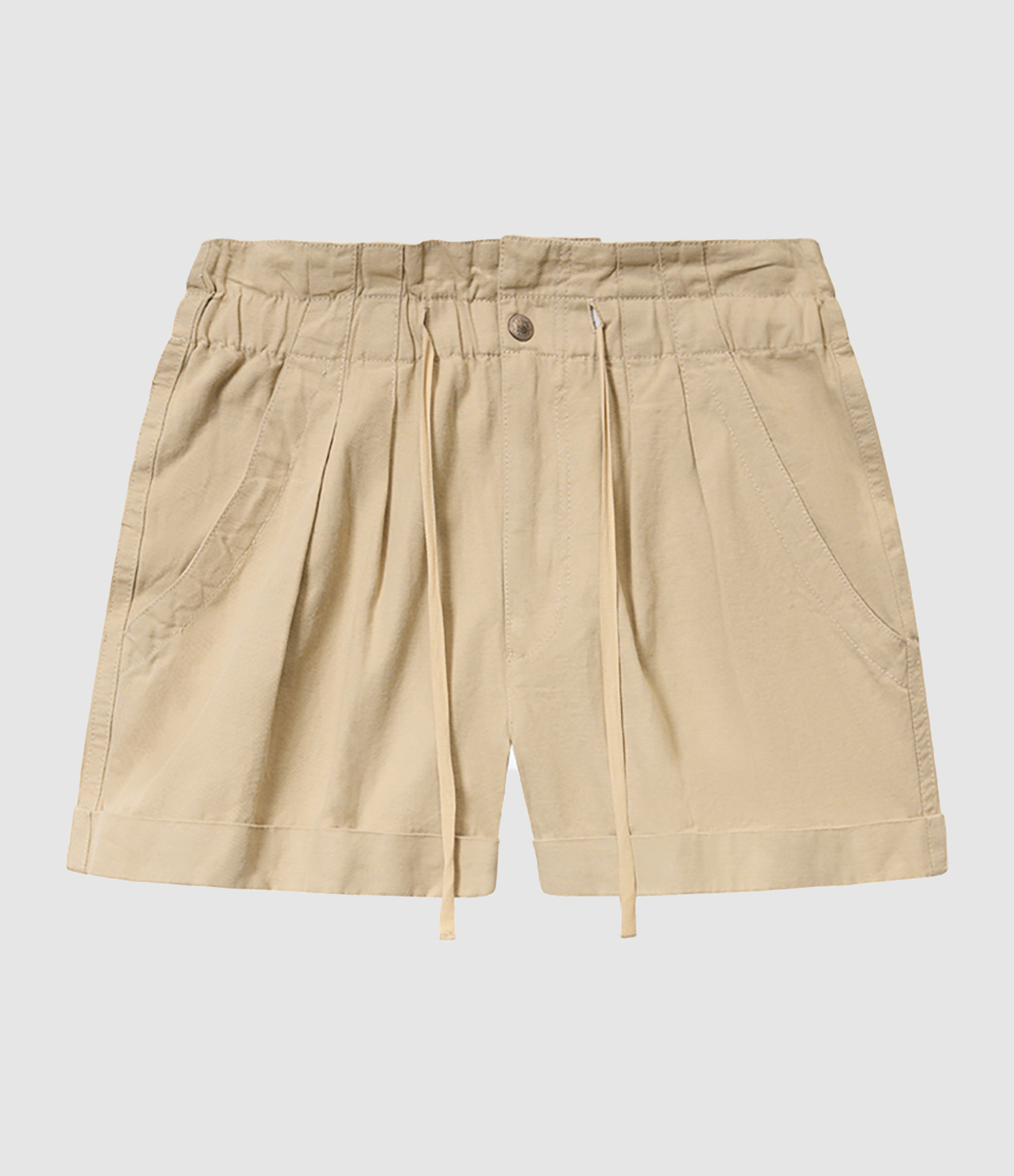 Short court en toile de coton et lin. Ceinture avec cordon de serrage et bouton pression. Poches latérales.