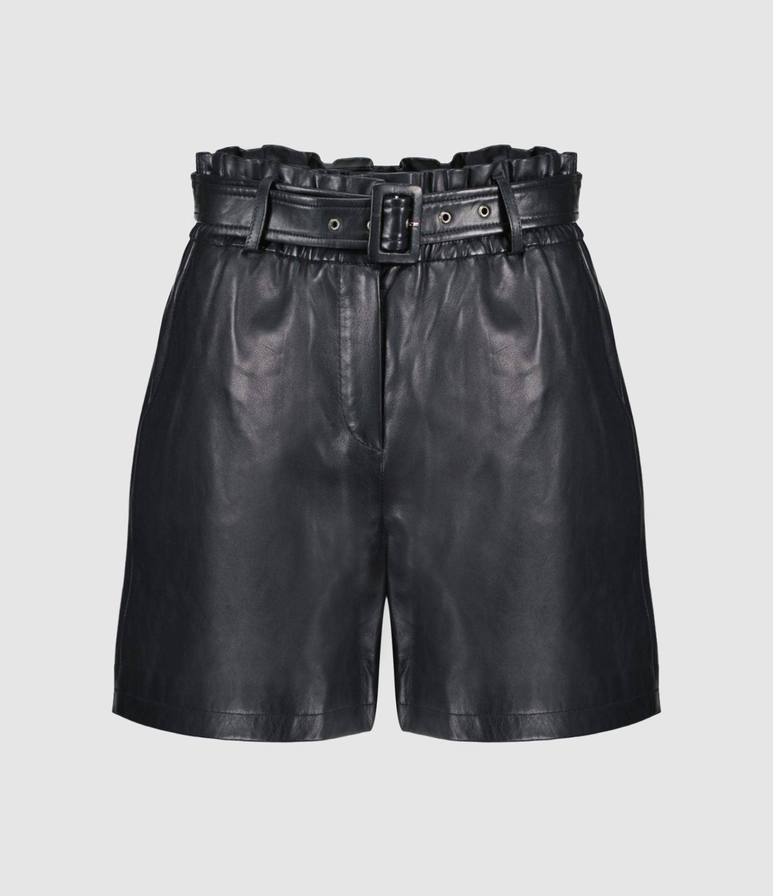 Short en cuir noir. Poches italiennes à l'avant. Poches passepoilées à l'arrière. Taille froncée. Passants pour ceinture. Fermeture par bouton pression et ceinture. Coupe droite. Base droite.