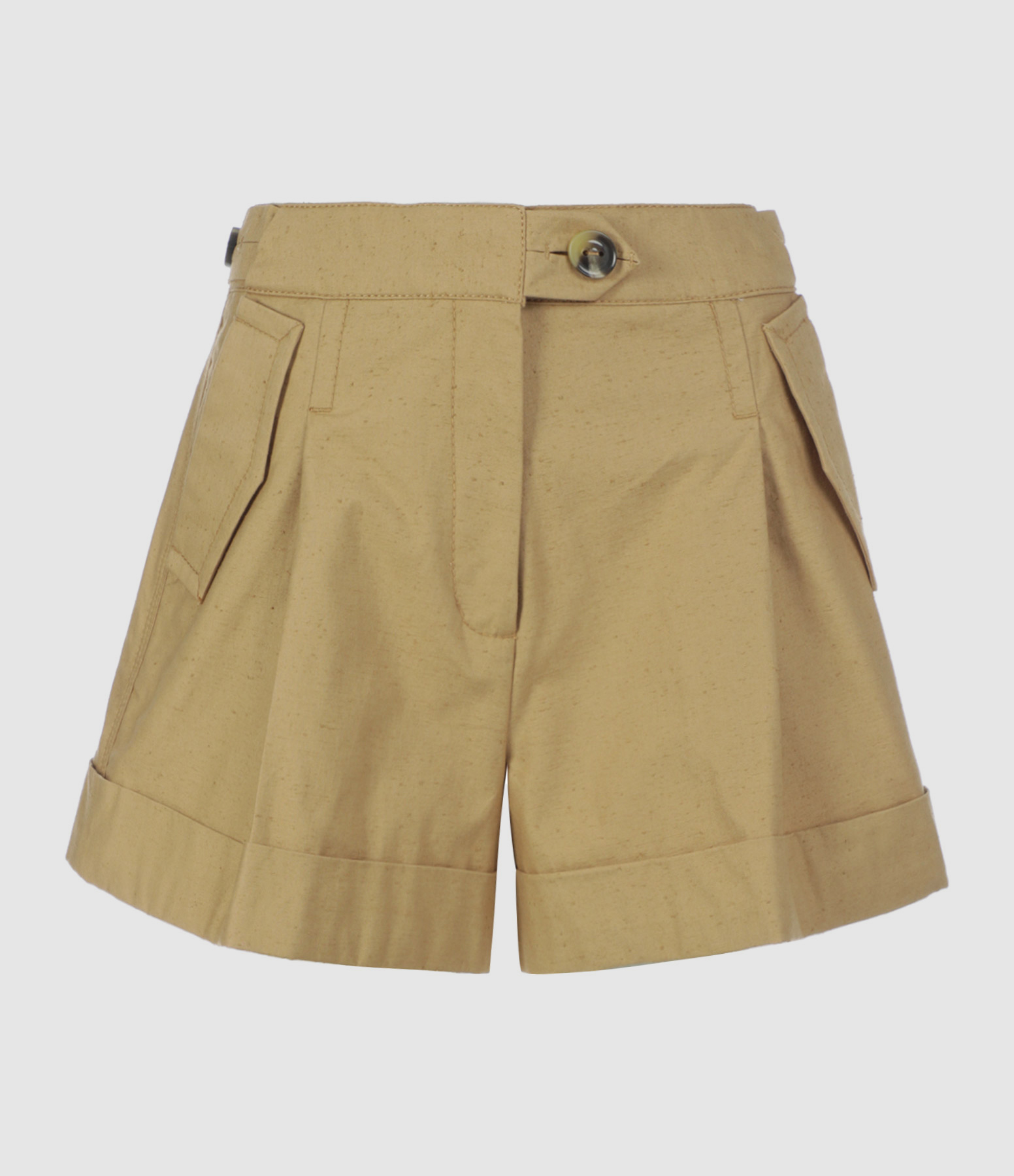 Short en coton marron. Taille haute. Fermeture par zip, crochets et boutons. Deux poches passepoilées avec faux rabat à l'avant et deux poches à rabats à l'arrière.