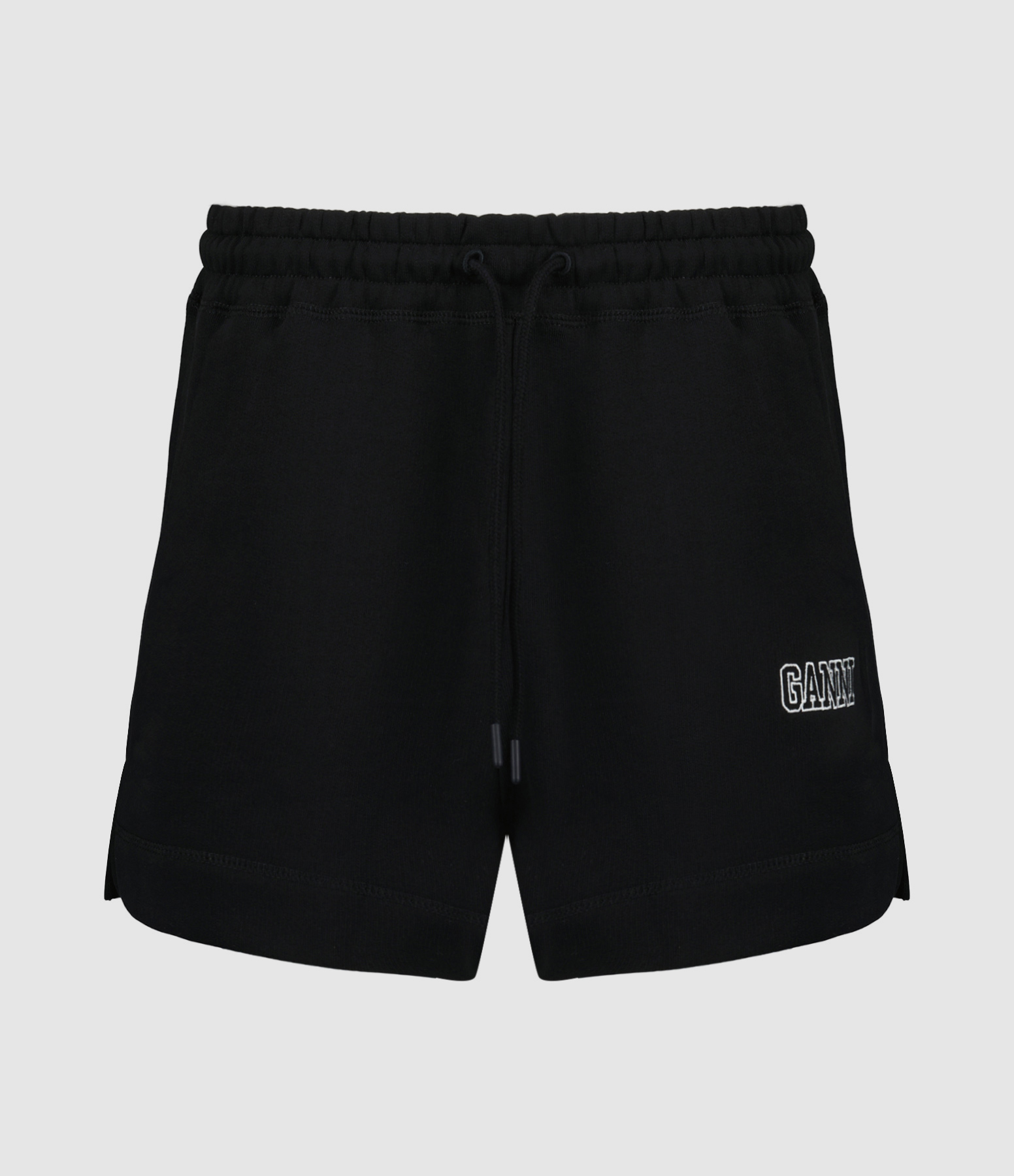 Short en coton molletonné noir. Logo "GANNI" brodé en blanc. Deux poches italiennes. Taille élastiquée avec liens de serrage. Fentes latérales.