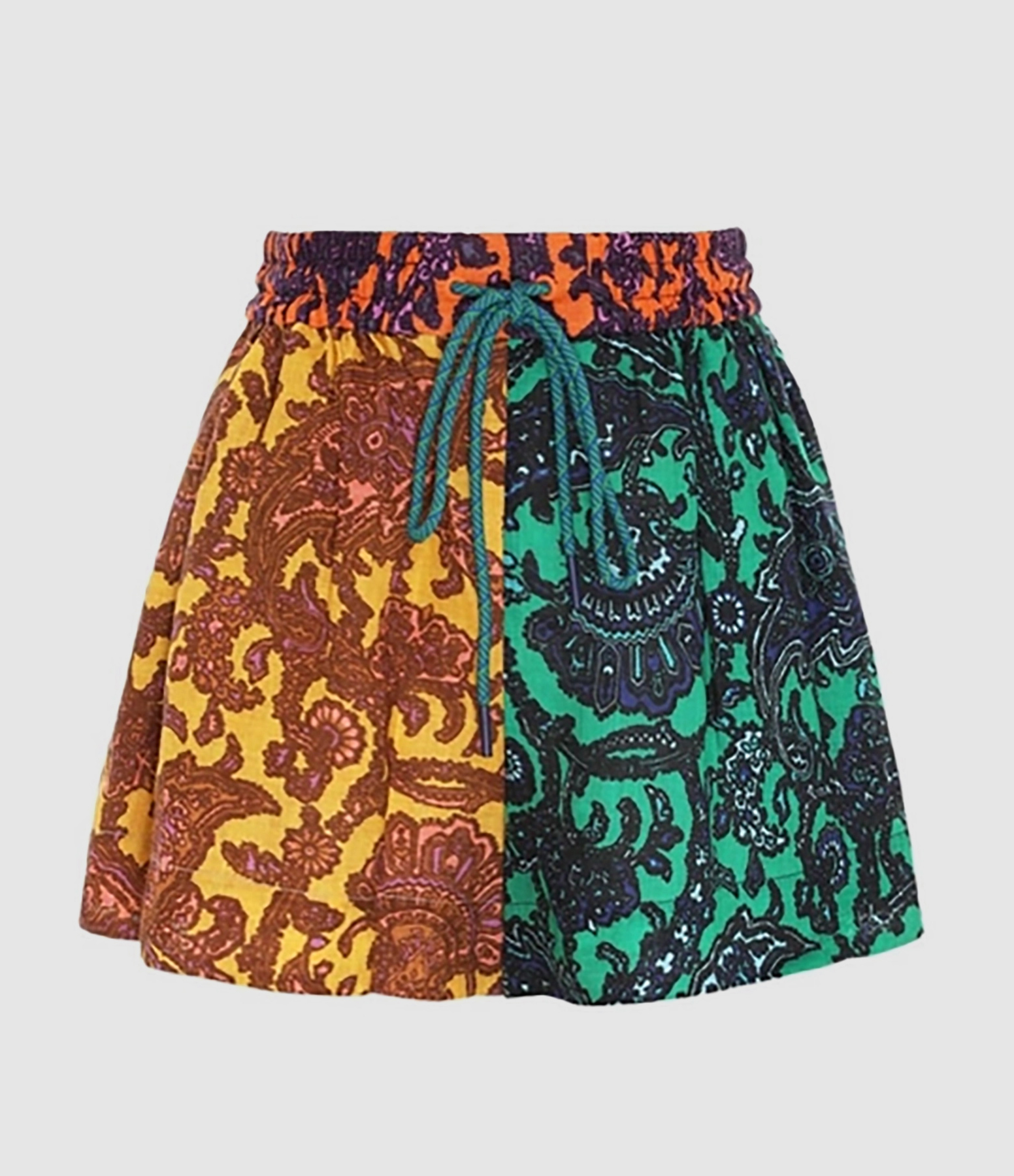 Short fluide en lin à imprimé cachemire multicolore. Taille élastiquée avec cordon de serrage à nouer. Deux poches à l'avant. Coupe ample. Base droite.