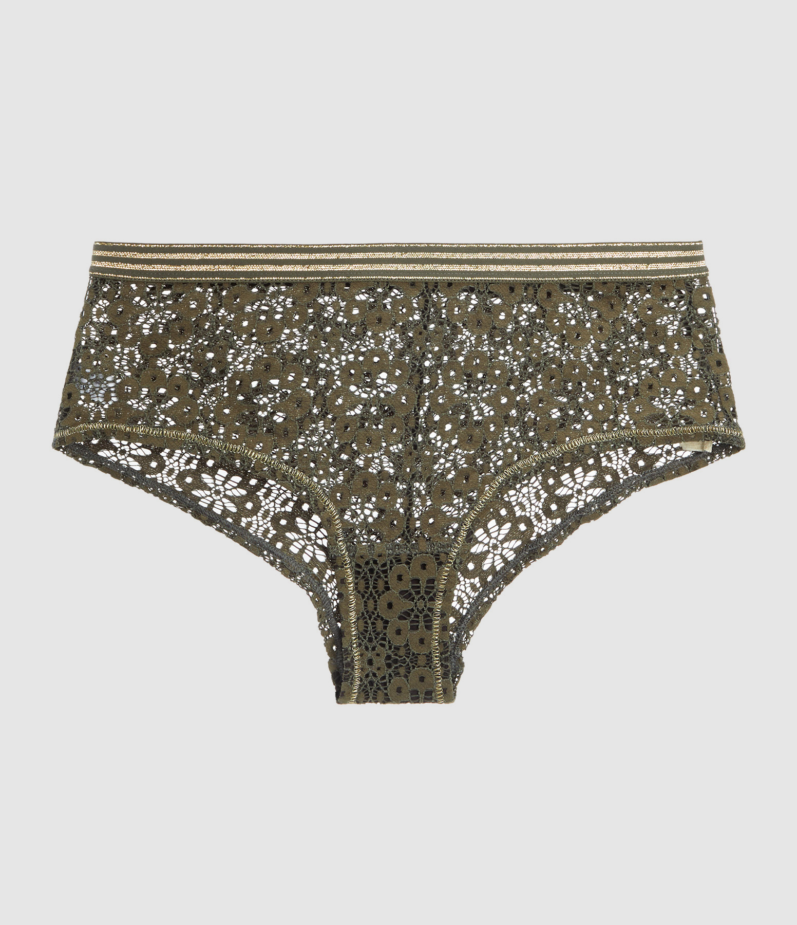 Shorty en dentelle kaki. Élastique à la taille avec lurex doré. Entièrement élastiqué pour assurer un maximum de confort.