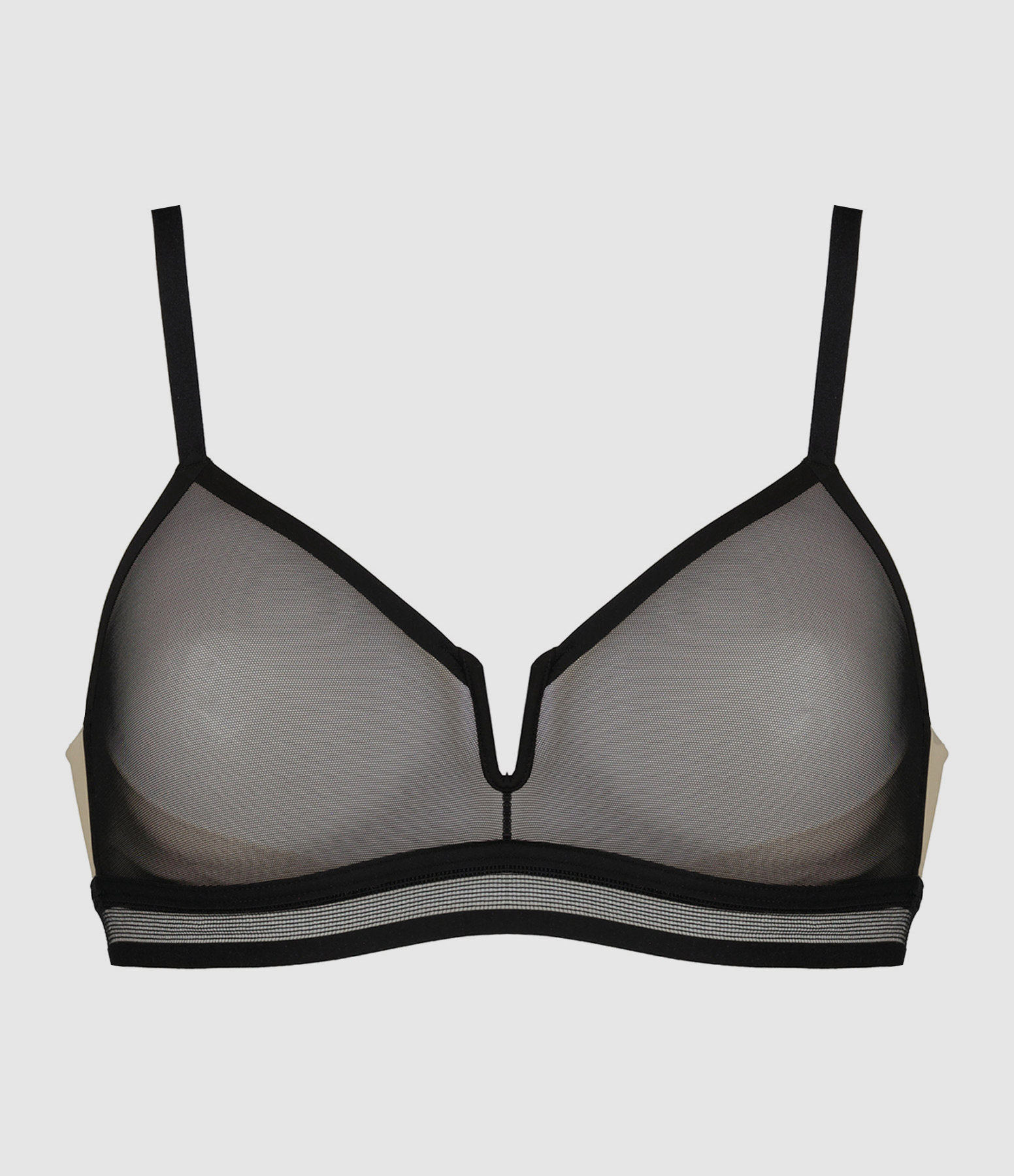Soutien-gorge triangle en tulle transparent noir. Séparateur métallique en V. Fermeture par deux agrafes.