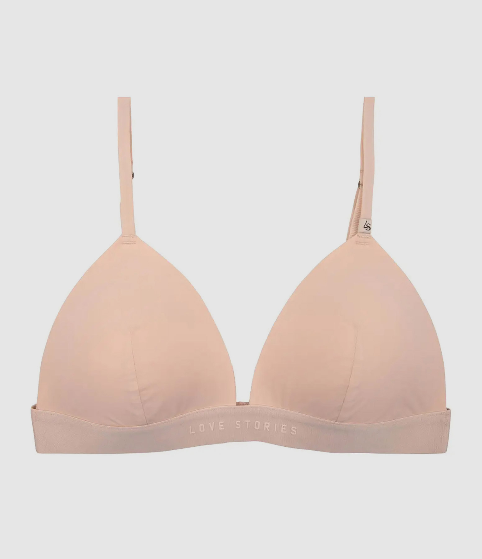 Soutien-gorge triangle sable avec rembourrage amovible pour une coupe flatteuse. Tissu doux. Bretelles réglables. Fermeture par trois niveaux d'agrafes à l'arrière.