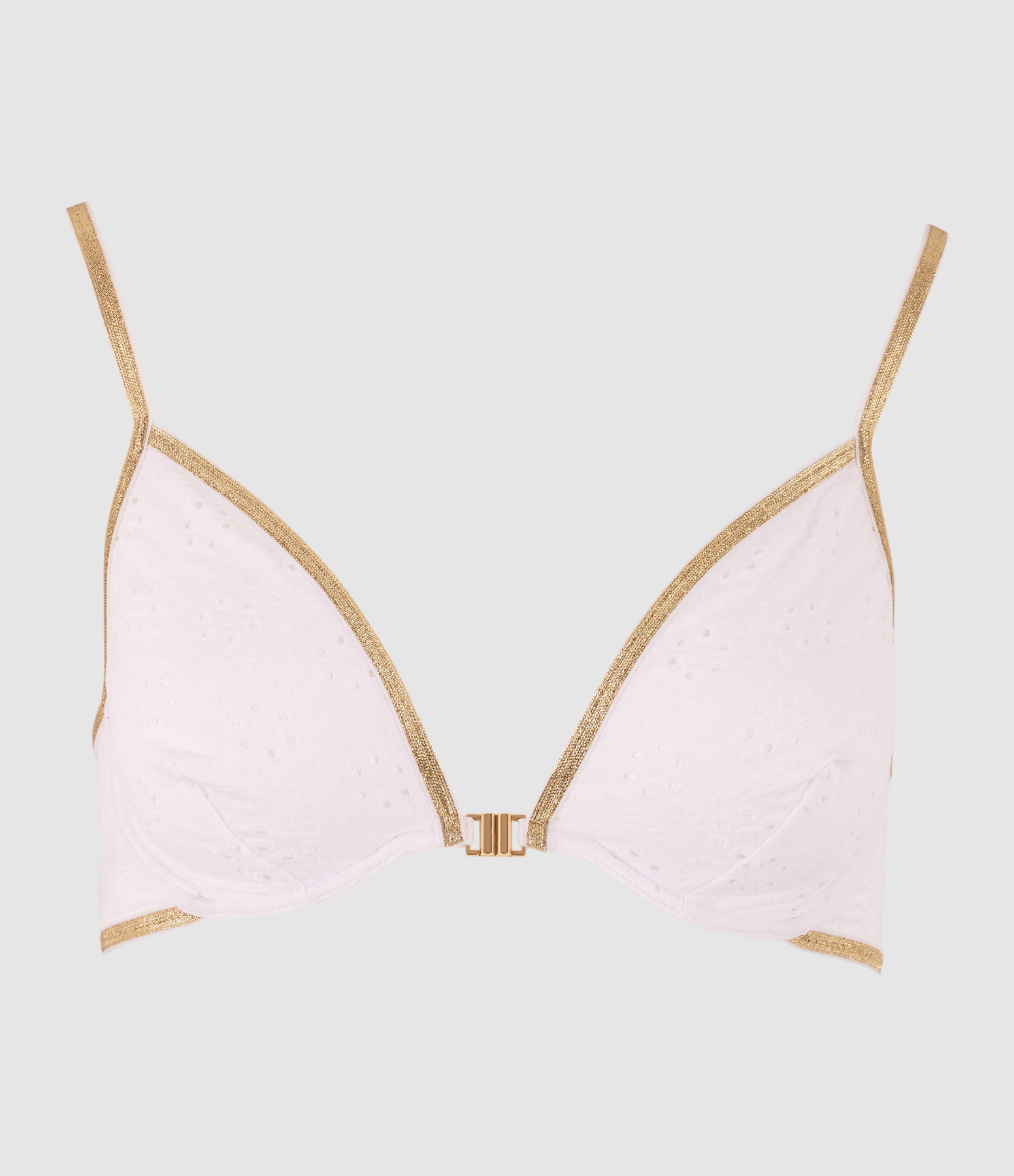 Soutien-gorge avec armatures blanc. Forme triangle décolleté en V fermeture à l'avant à crochet. Bretelles lurex dorées pailletées.