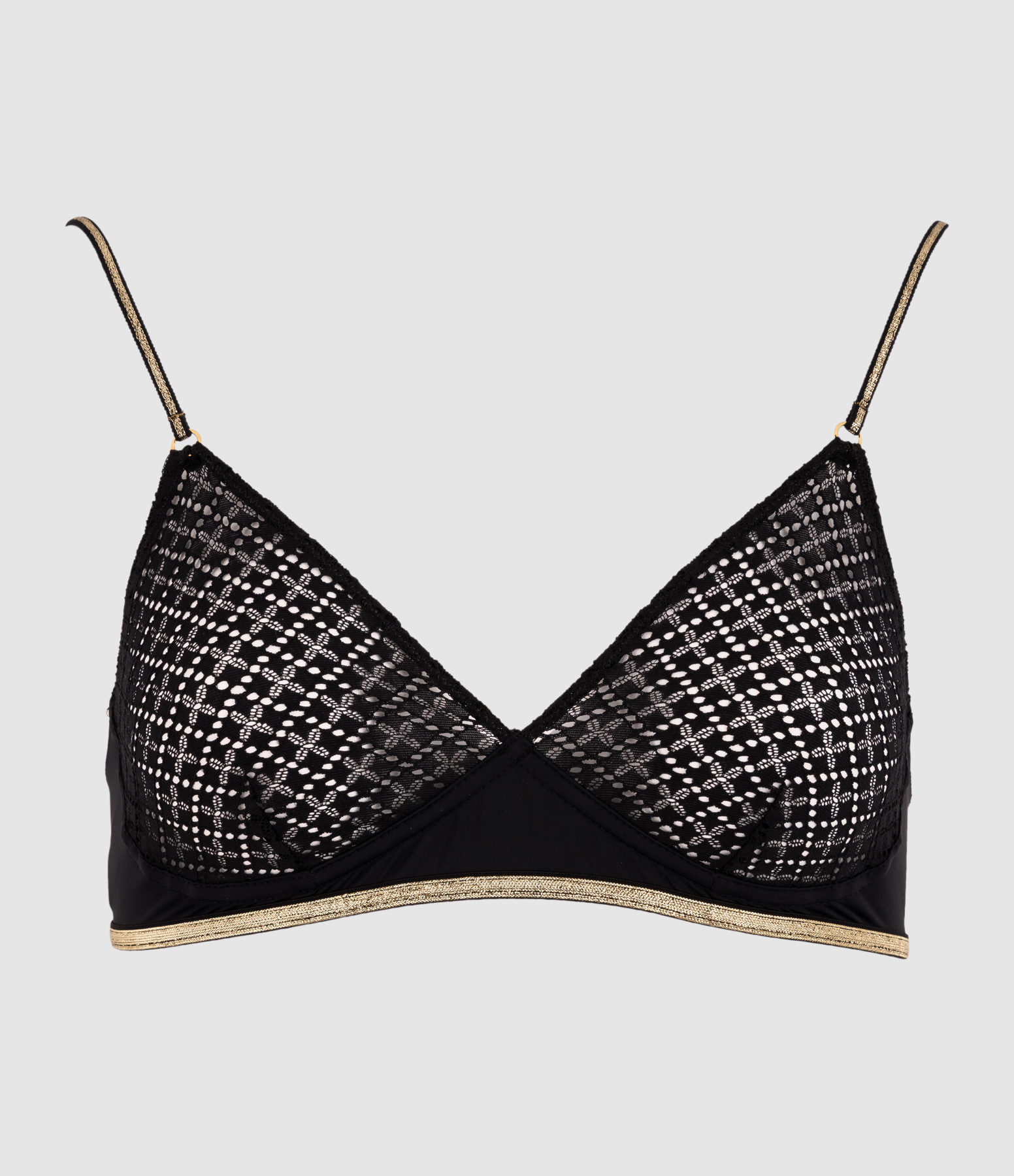 Soutien-gorge noir ajouré, sans armatures. Liseré doré et élastique noir uni sous la poitrine. Bretelles ajustables. Entièrement élastiqué.