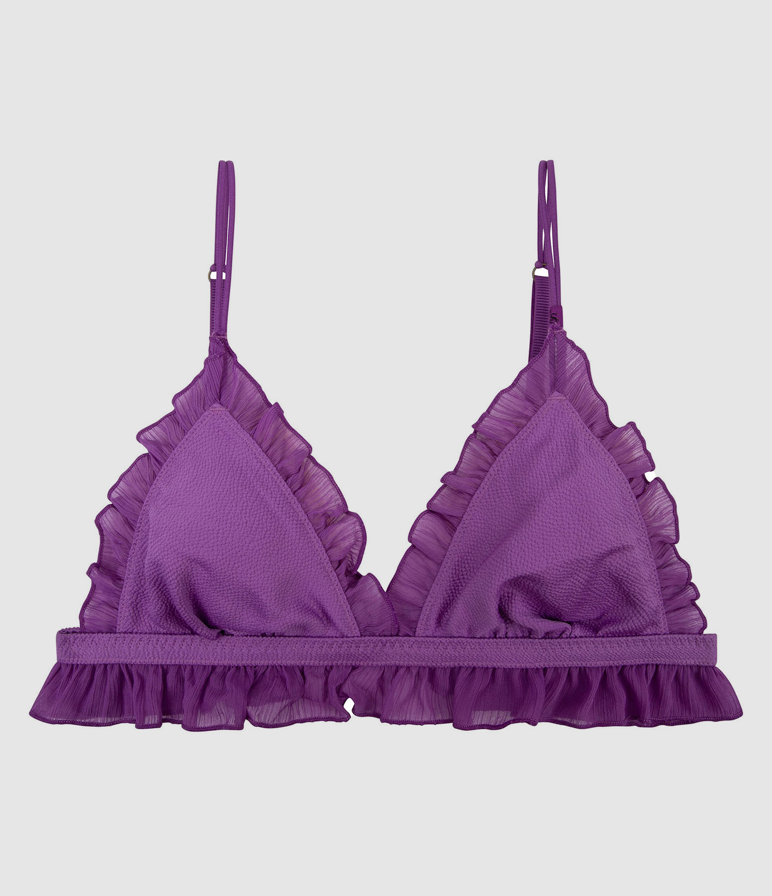Soutien-gorge sans armature en tissu filet violet. Finitions à volants. Base élastiquée, fermeture par trois niveaux d'agrafes. Bretelles réglables.
