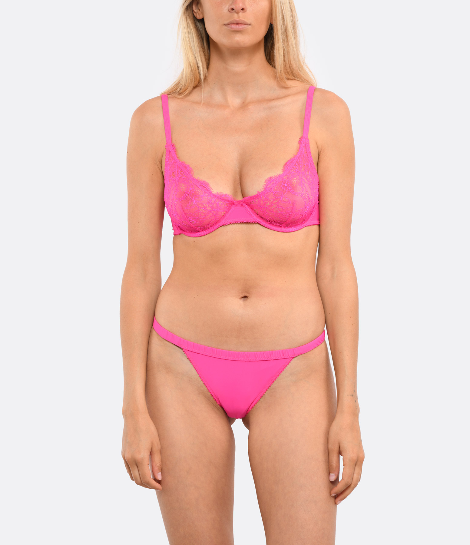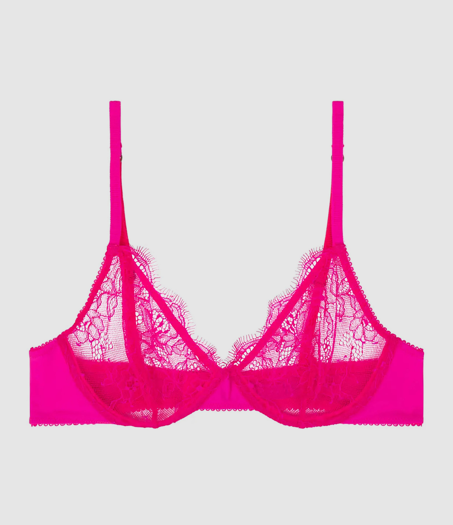 Soutien-gorge triangle à armatures en dentelle rose vif. Fermeture par trois niveaux d'agrafes. Bretelles réglables. Non rembourré.