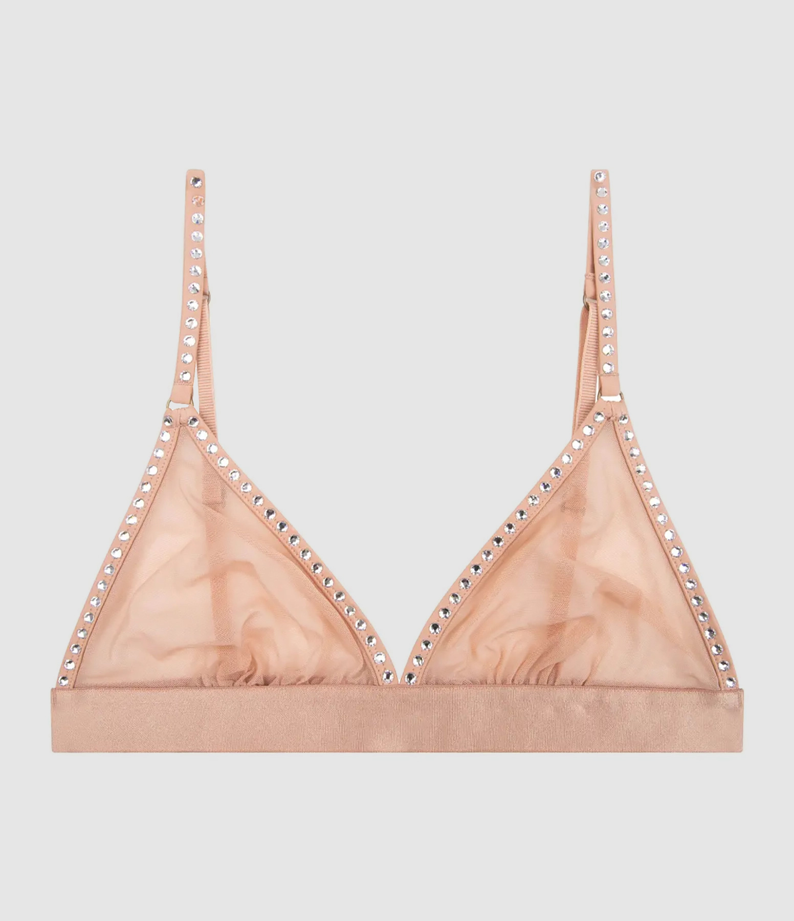 Soutien-gorge sans armature en tissu filet beige. Strass argenté sur les bretelles et les bords du triangle. Base élastiquée, fermeture par trois niveaux d'agrafes. Bretelles réglables.
