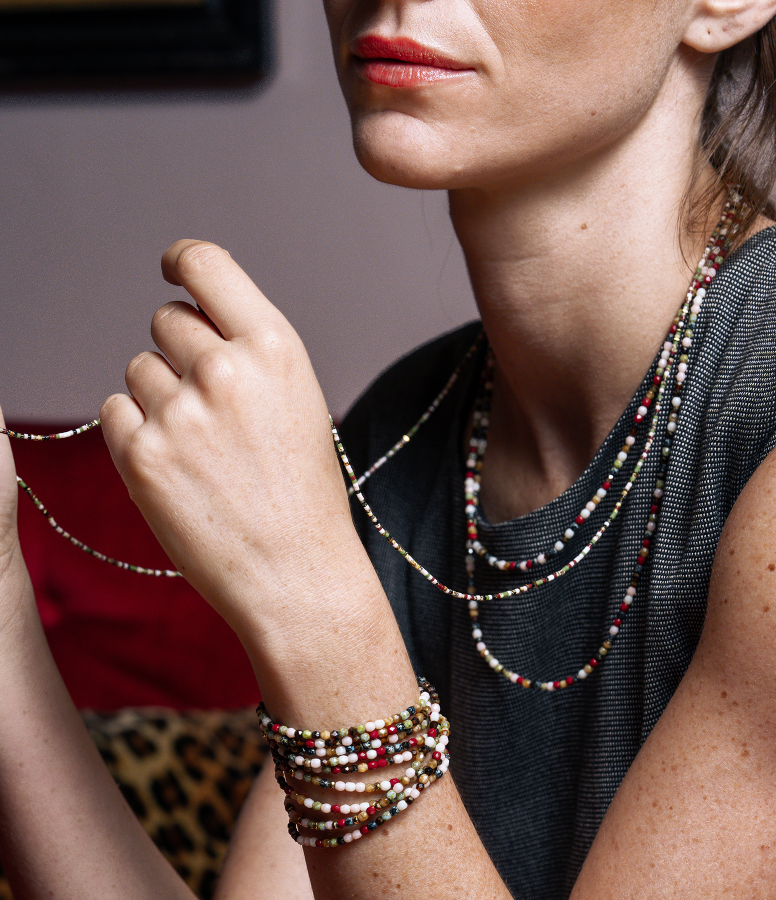 Collier et Bracelet 6 Tours Nadège Bordeaux 103cm