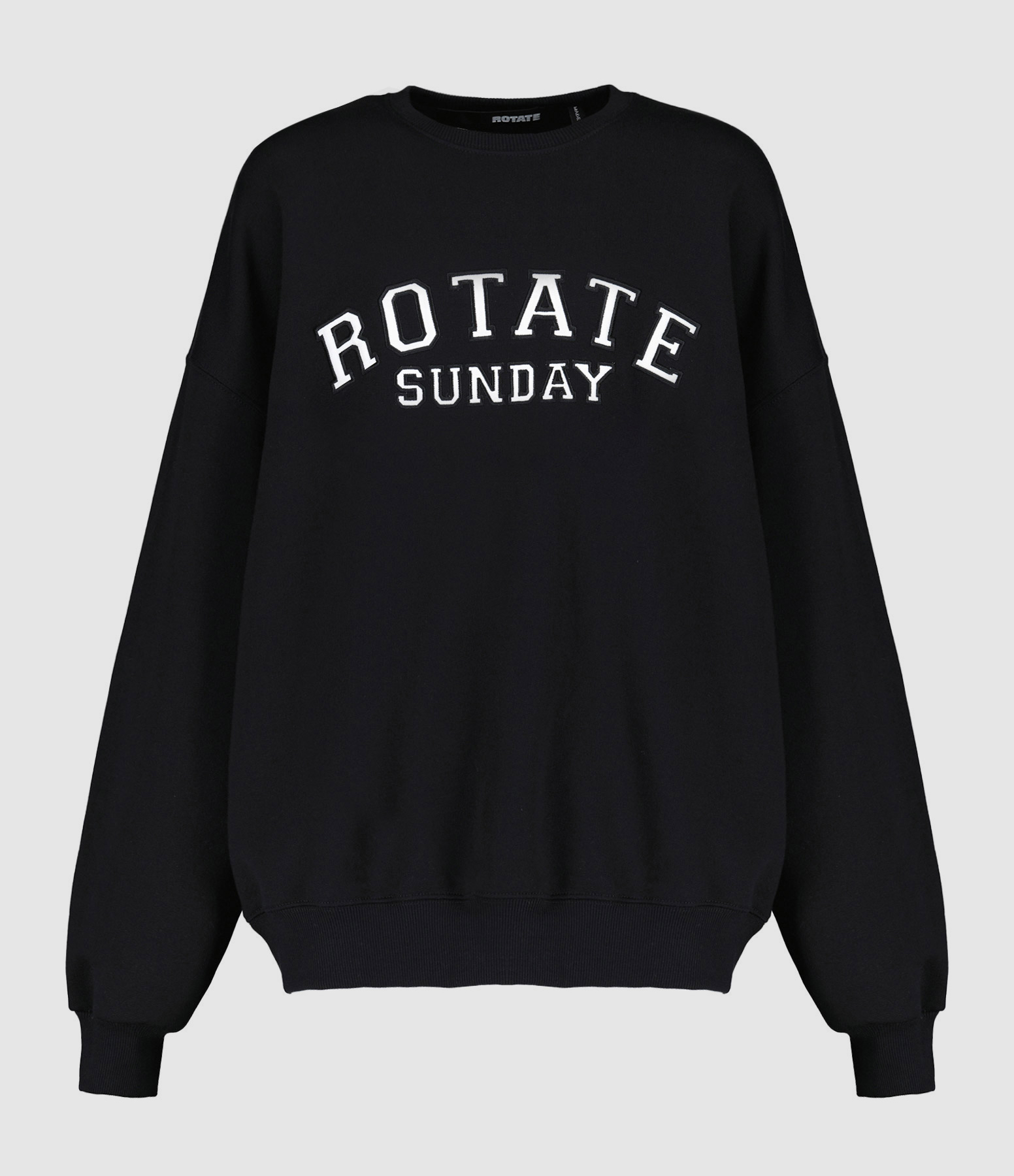 Sweatshirt en coton molletonné noir avec l'inscription "Rotate Sunday" brodée en blanc sur le devant. Col rond côtelé. Manches longues avec poignets côtelés. Coupe oversized. Base droite côtelée.
