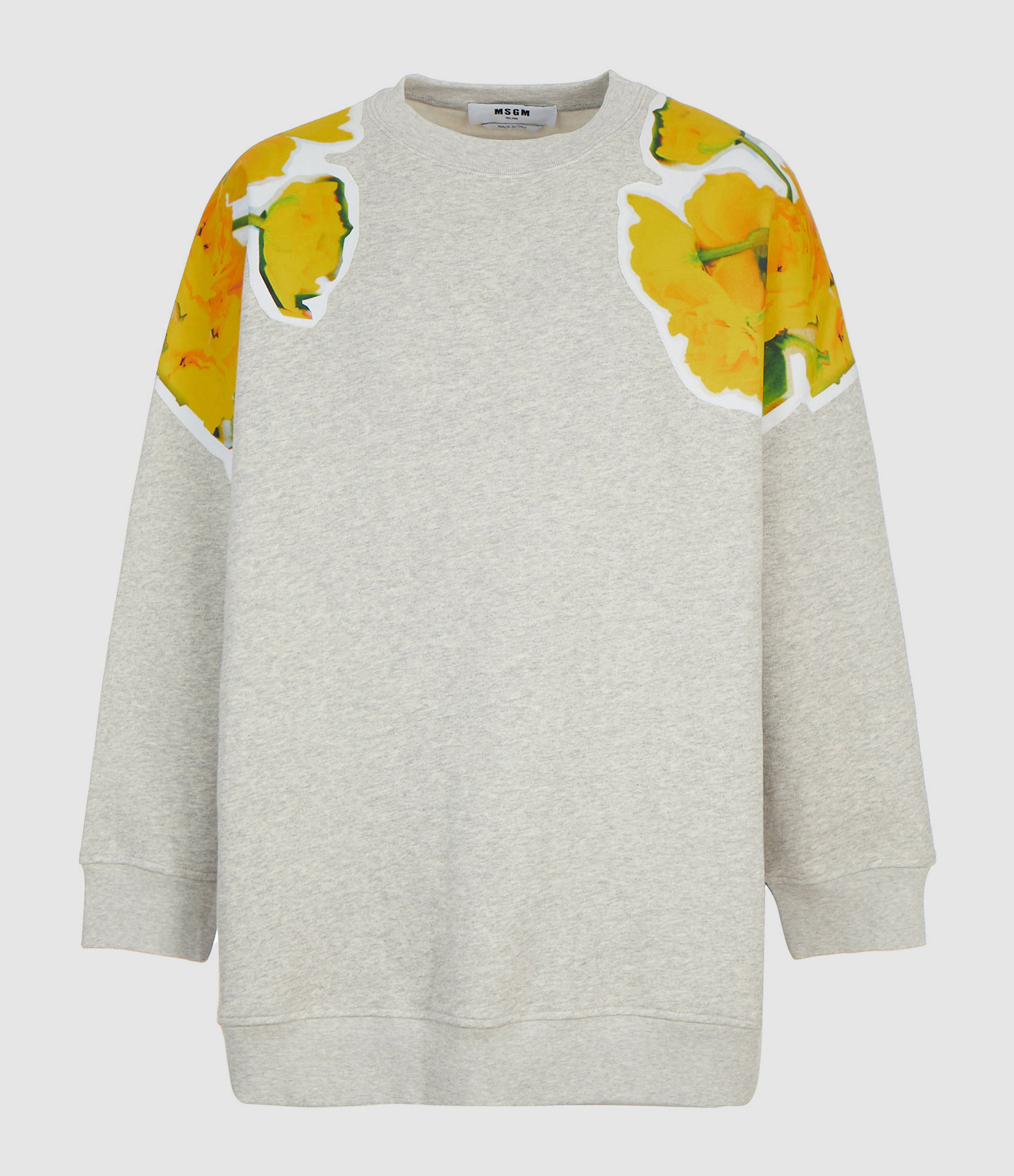 Sweatshirt en coton gris chiné. Col rond. Manches longues. Empiècement sur les épaules avec sérigraphie jaune. Coupe ample. Base droite.
