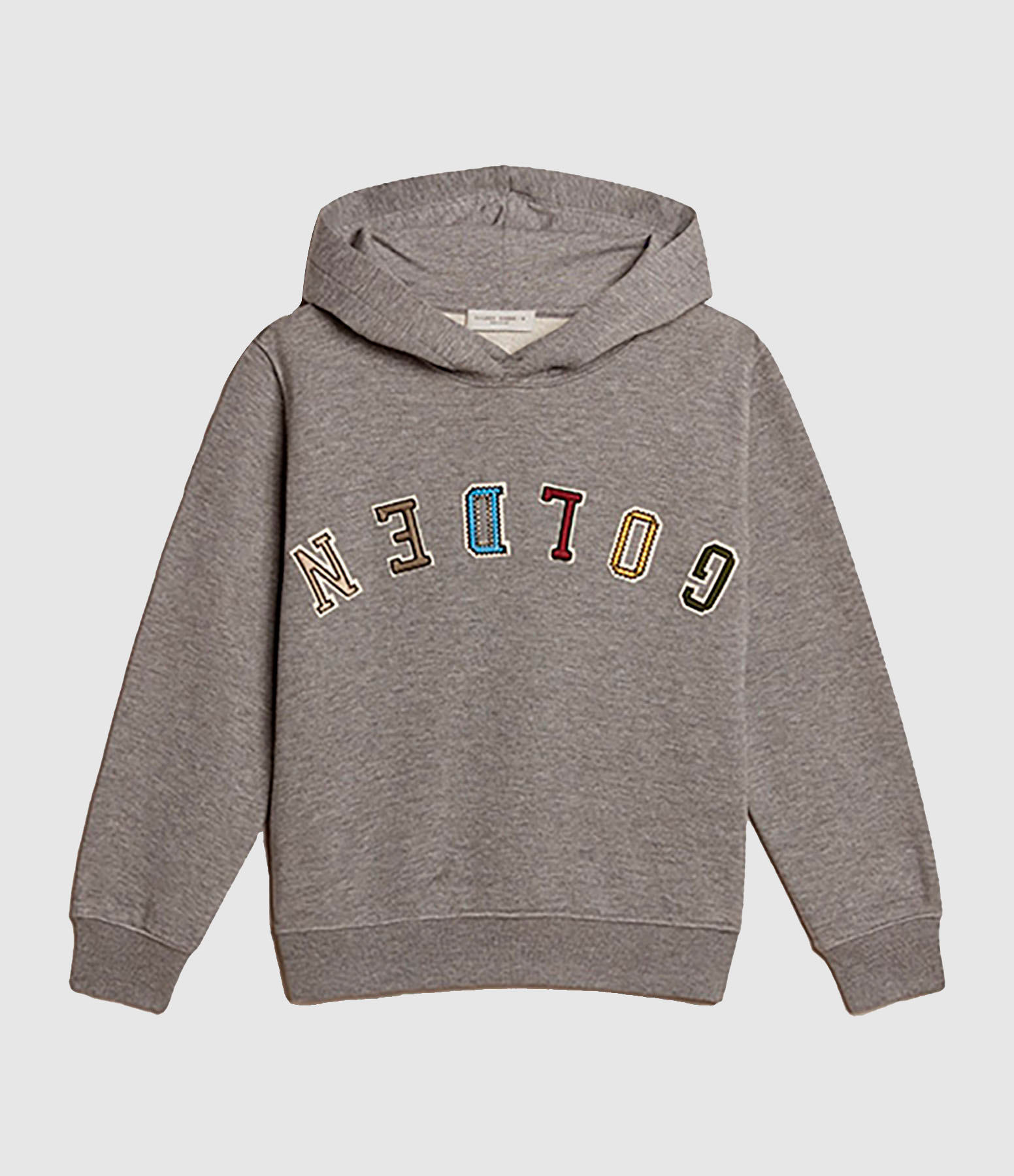 Sweatshirt en coton gris chiné. Inscription golden multicolore. Capuche. Manches longues. Coupe droite. Base droite.