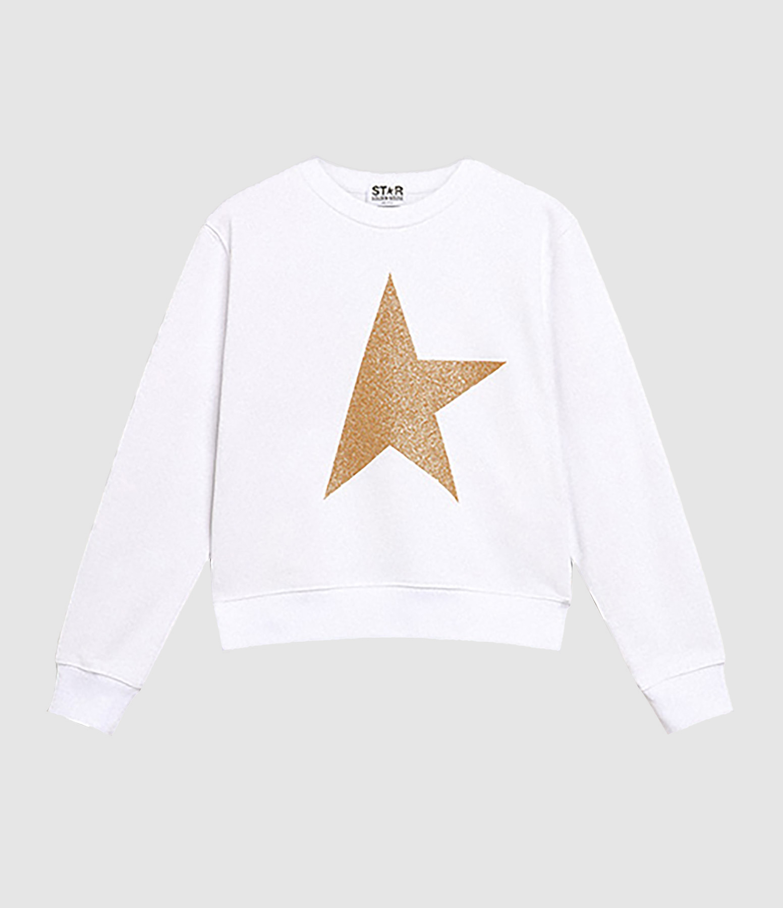 Sweatshirt en coton molletonné blanc. Logo étoile doré pailleté sérigraphié sur le devant. Col rond côtelé. Manches longues avec poignets côtelés. Inscription "STAR GOLDEN GOOSE" sérigraphiée en doré dans le dos. Coupe droite. Base droite côtelée.