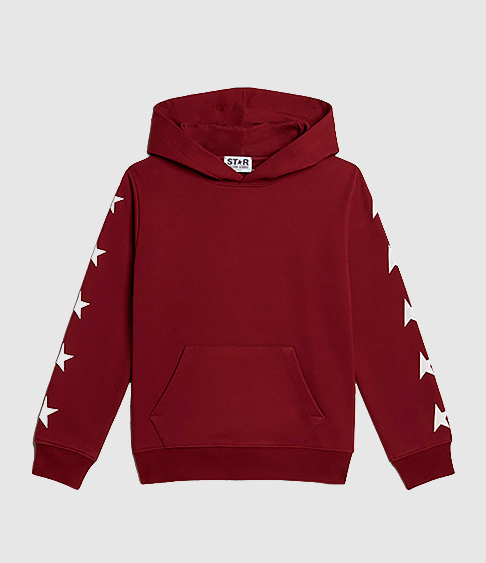 Sweatshirt en coton bordeaux. Capuche. Poche kangourou. Manches longues avec motif étoiles blanches et resserrées aux poignets. Coupe droite. Base droite.