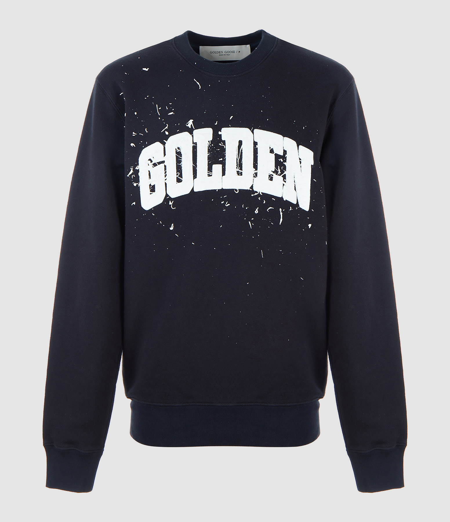 Sweatshirt en coton bleu marine pour homme. Impression "Golden" effet taches de peinture blanche sur le devant. Col rond. Manches longues. Coupe droite. Base droite. Non doublé.