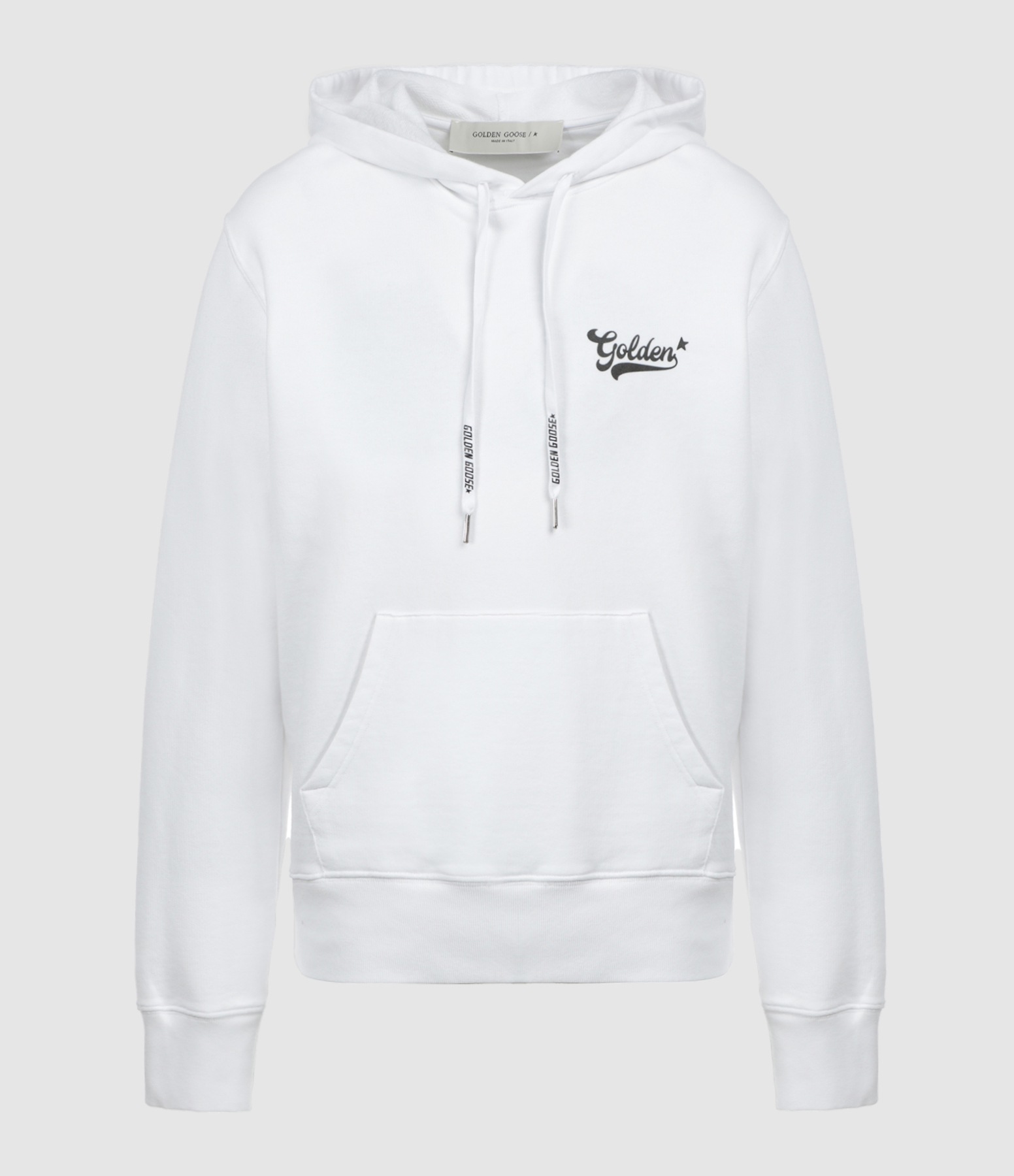 Sweatshirt à capuche en coton blanc, sérigraphie "Golden" sur la poitrine. Sérigraphie et broderie colorée au dos. Manches longues. Coupe droite. Base droite.