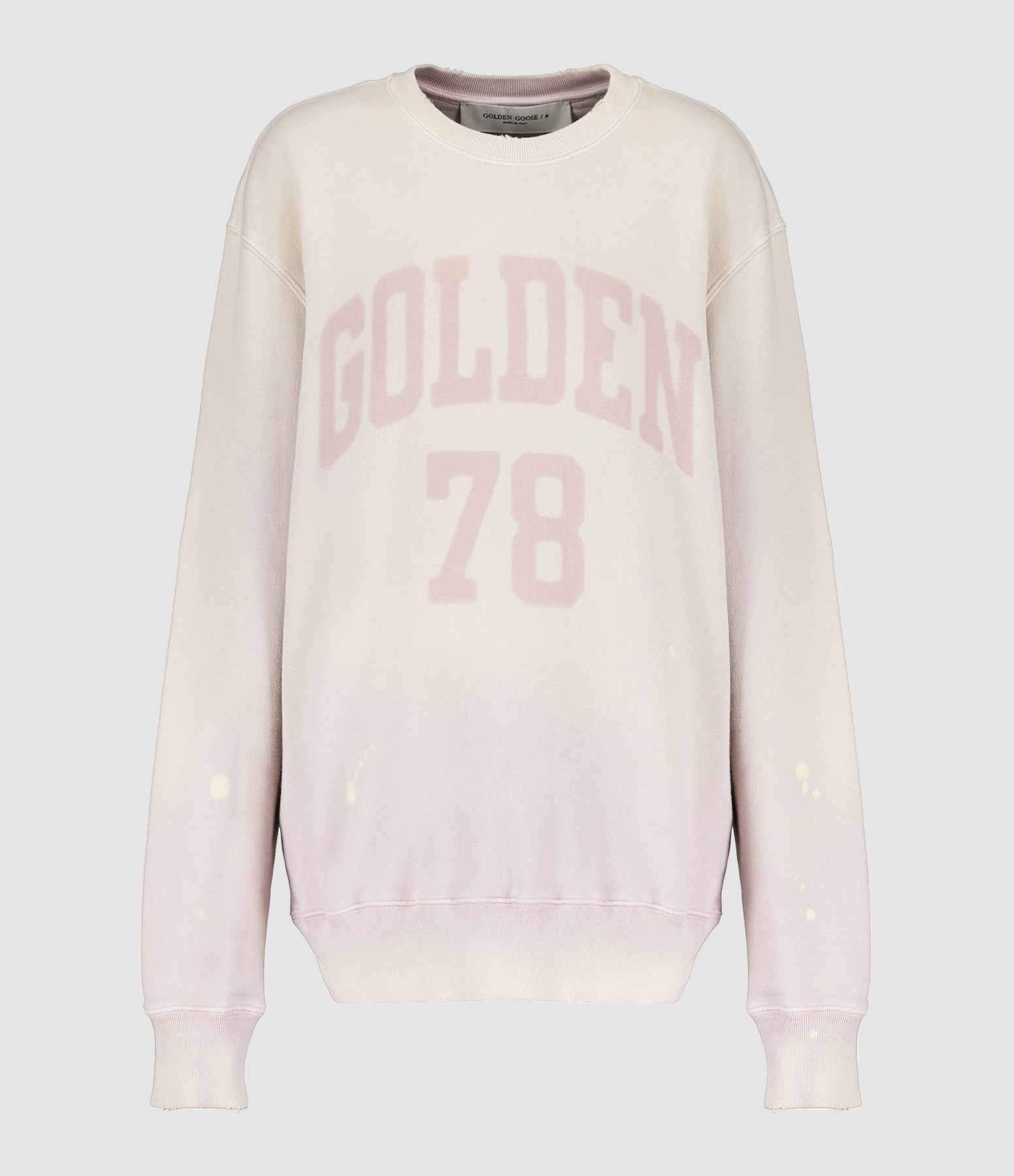 Sweatshirt en coton molletonné rose. Logo "GOLDEN" réalisé selon la teinture à réserve. Col rond. Manches longues bishop. Effet usé et tâché volontairement. Coupe droite. Base droite. Non doublé.