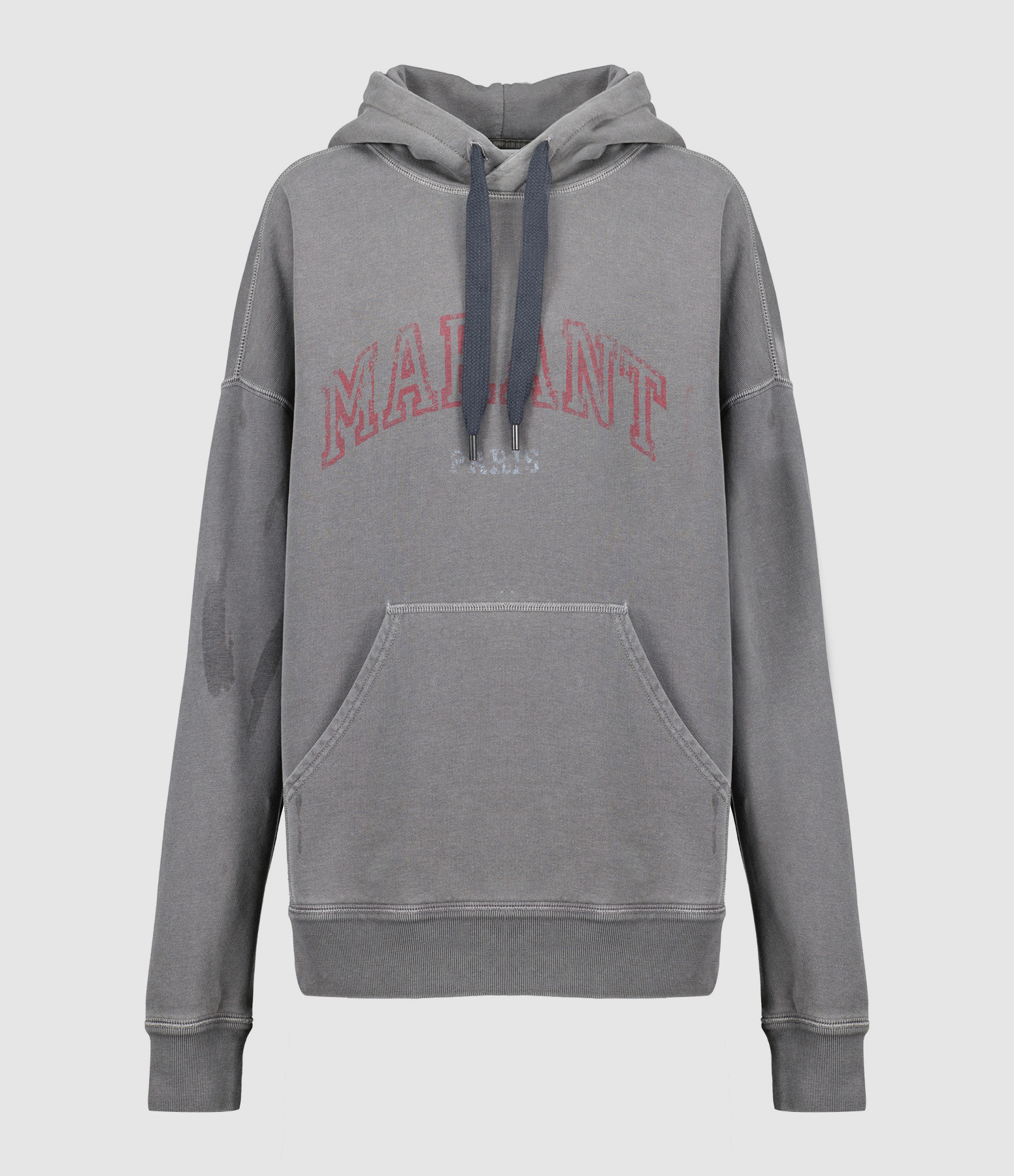 Sweatshirt en coton gris délavé. Col à capuche avec cordon de serrage. Manches longues. Poche kangourou sur le devant. Logo "Marant" en rouge sur le devant. Coupe droite. Base droite.