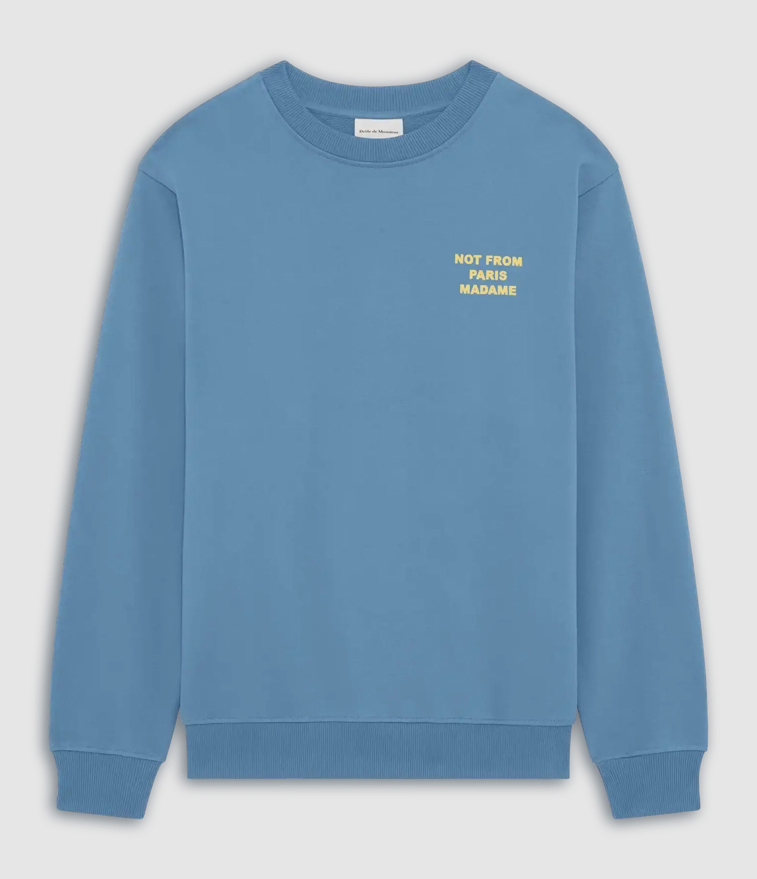 Sweatshirt bleu, col rond et manches longues. Logo "Not from Paris Madame" brodé sur la poitrine côté gauche et sur le dos.