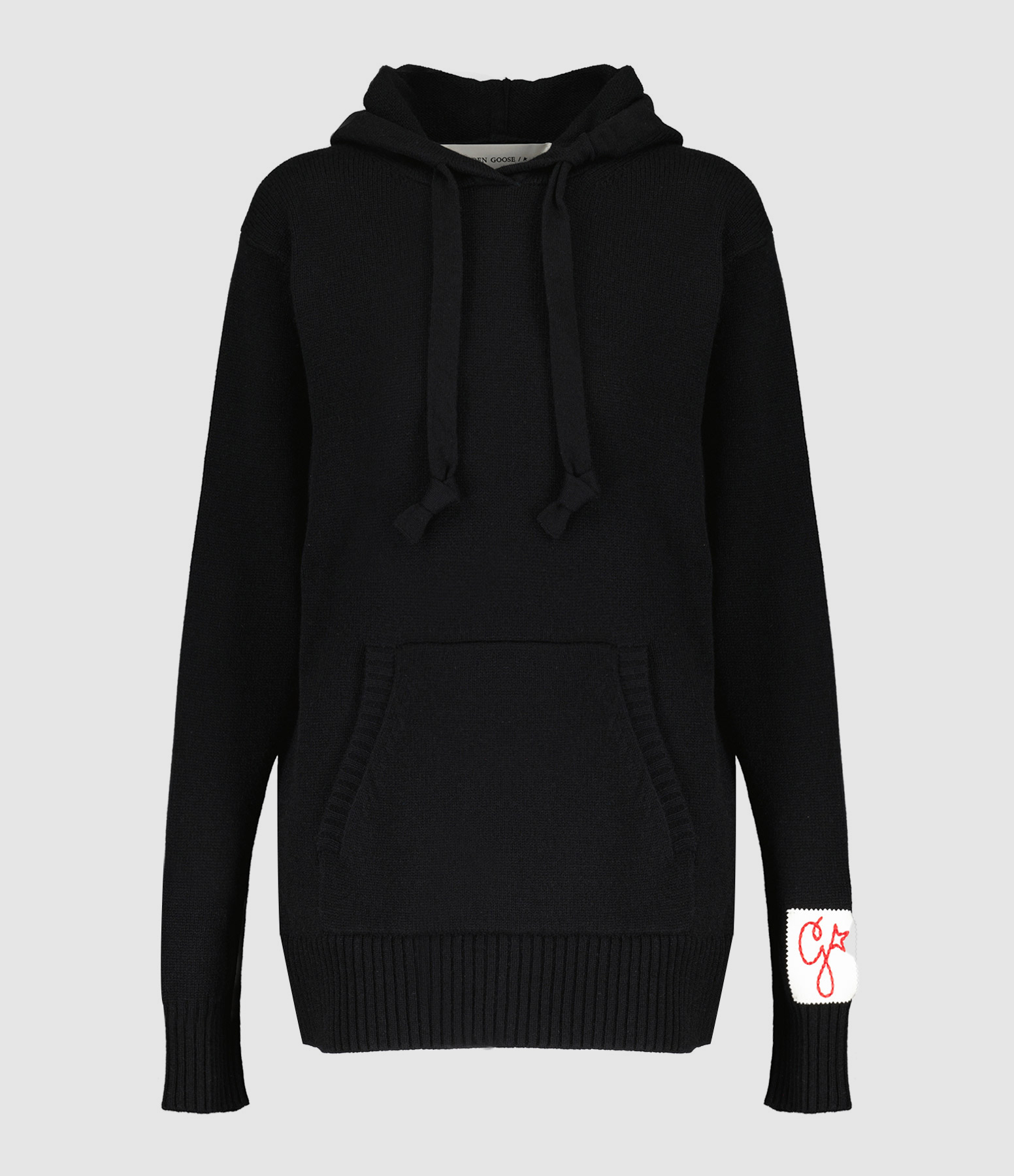 Sweatshirt en tricot de cachemire et laine noir. Col à capuche avec cordon de serrage. Manches longues avec poignets côtelés. Un patch amovible avec la lettre G brodée en rouge sur le poignet gauche. Une poche kangourou sur le devant. Double logo étoile en métal bronze dans la nuque. Coupe ample. Base droite côtelée.