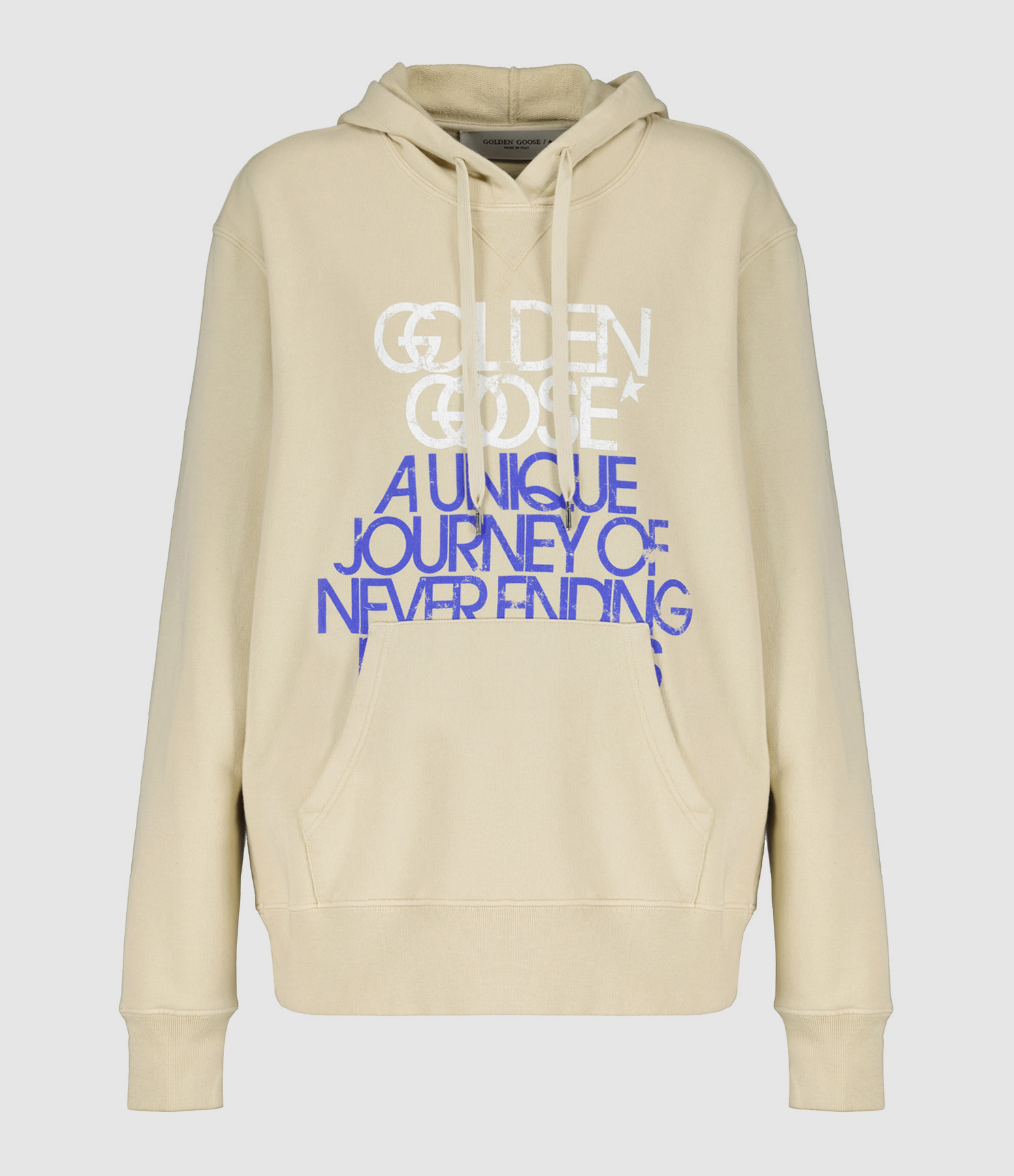 Sweatshirt en coton molletonné beige avec l'inscription "Golden Goose A Unique Journey Of Never Ending Discoveries" imprimée en blanc et bleu sur le devant. Col à capuche avec cordon de serrage. Manches longues avec poignets côtelés. Une poche kangourou sur le devant avec une inscription imprimée en rouge à l'intérieur de la poche. Double logo étoile en métal bronze dans la nuque. Coupe ample. Base droite côtelée;