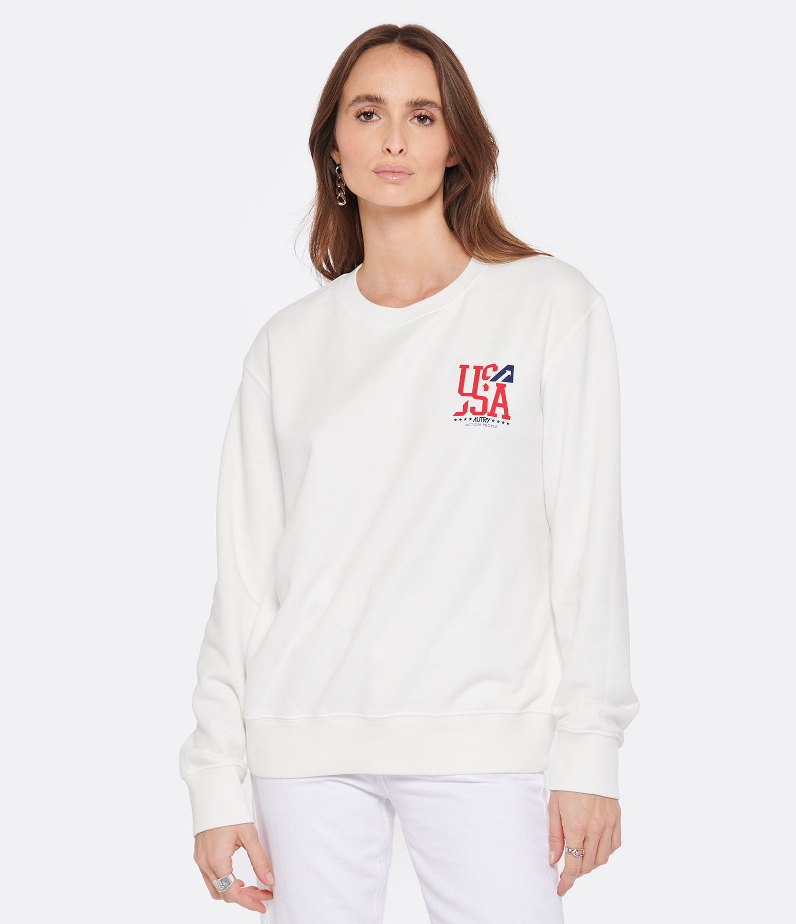 Sweatshirt en coton blanc avec inscriptions sur la poitrine et dans le dos "USA" en rouge et bleu marine. Col rond. Manches longues avec poignets côtelés. Coupe droite. Base droite.