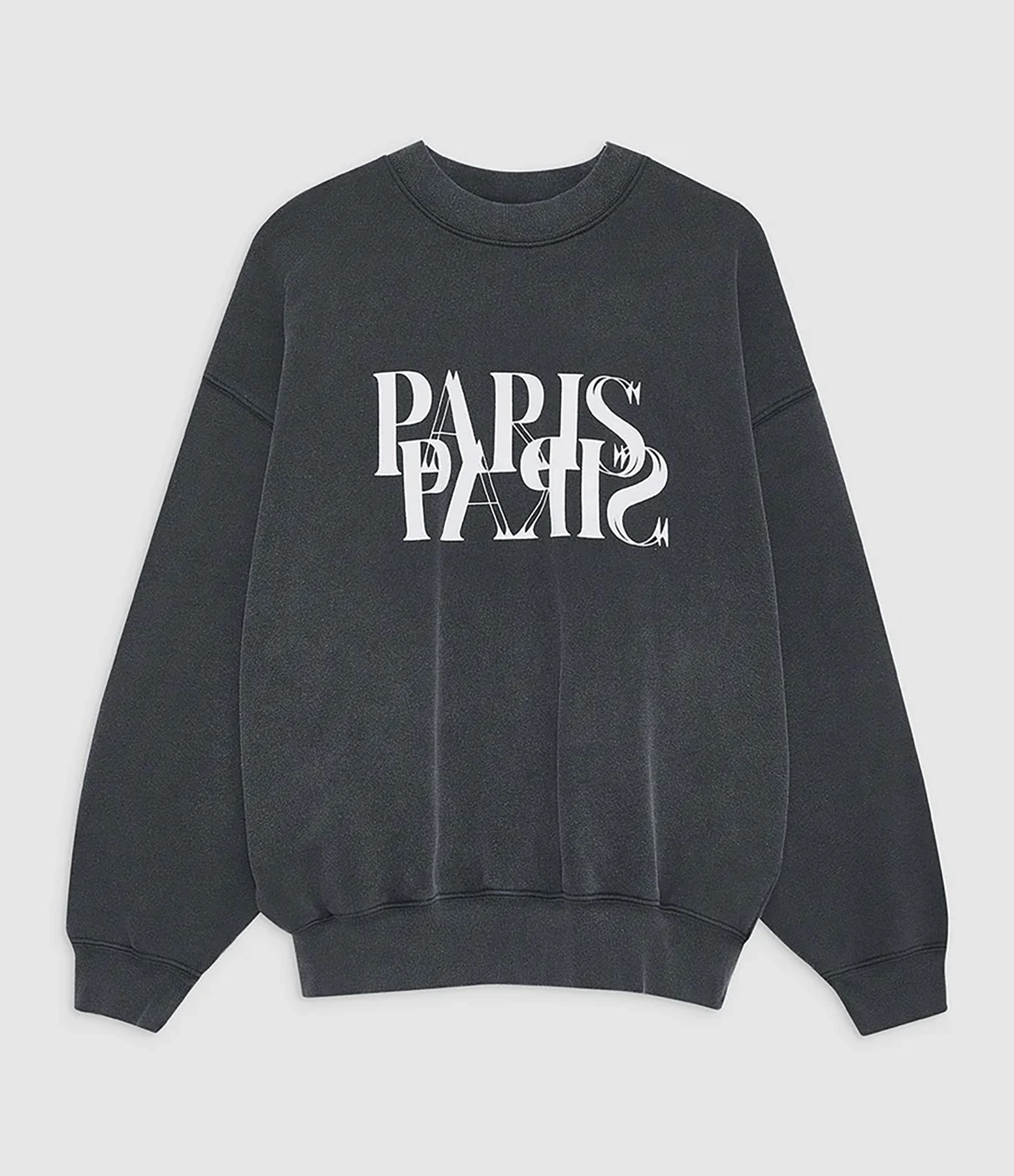 Sweatshirt en coton noir délavé. Inscription "PARIS" flockée blanche sur le devant. Inscription blanche flockée dans le dos. Col rond côtelé. Manches longues resserrées aux poignets. Coupe droite. Base droite. Non doublé.