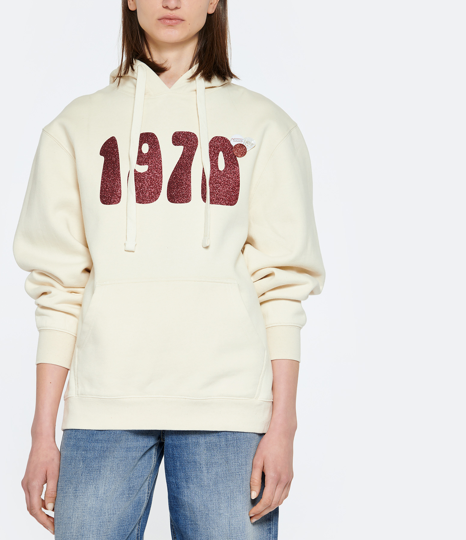 Sweatshirt à capuche en coton écru avec inscription "1970" rouge pailleté sur le devant. Trois badges côté cœur. Poche kangourou. Manches longues. Base droite.
