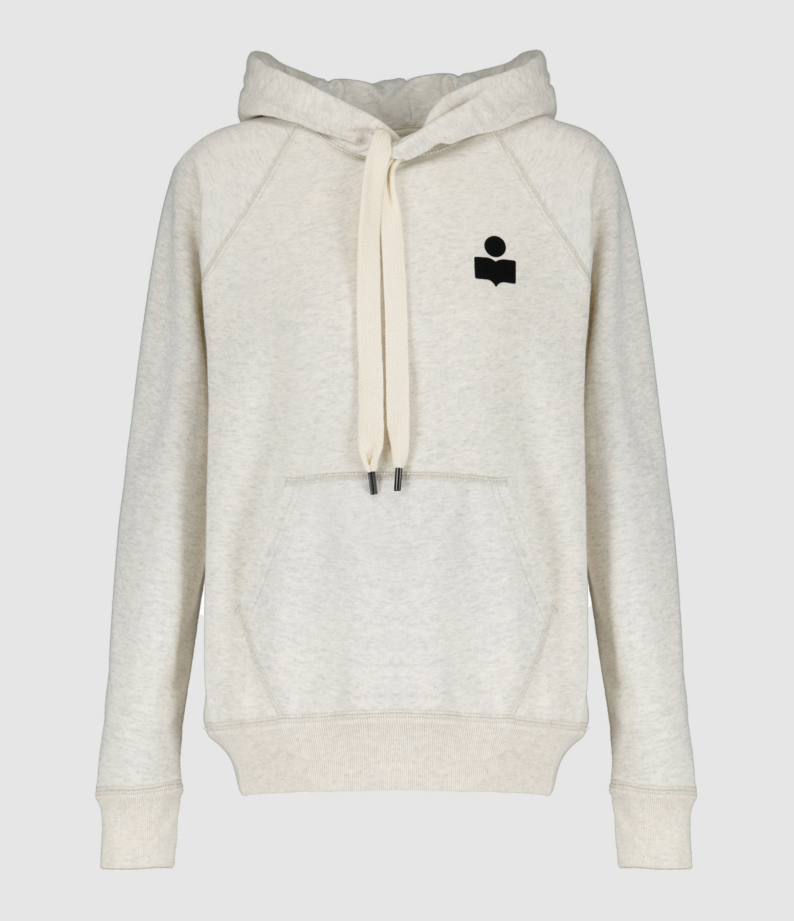 Sweatshirt en coton molletonné mélangé écru chiné avec le logo flocké velours en noir sur la poitrine. Col à capuche avec liens de serrage. Une poche kangourou à l'avant. Manches longues avec poignets côtelés. Coupe ample. Base droite côtelée.