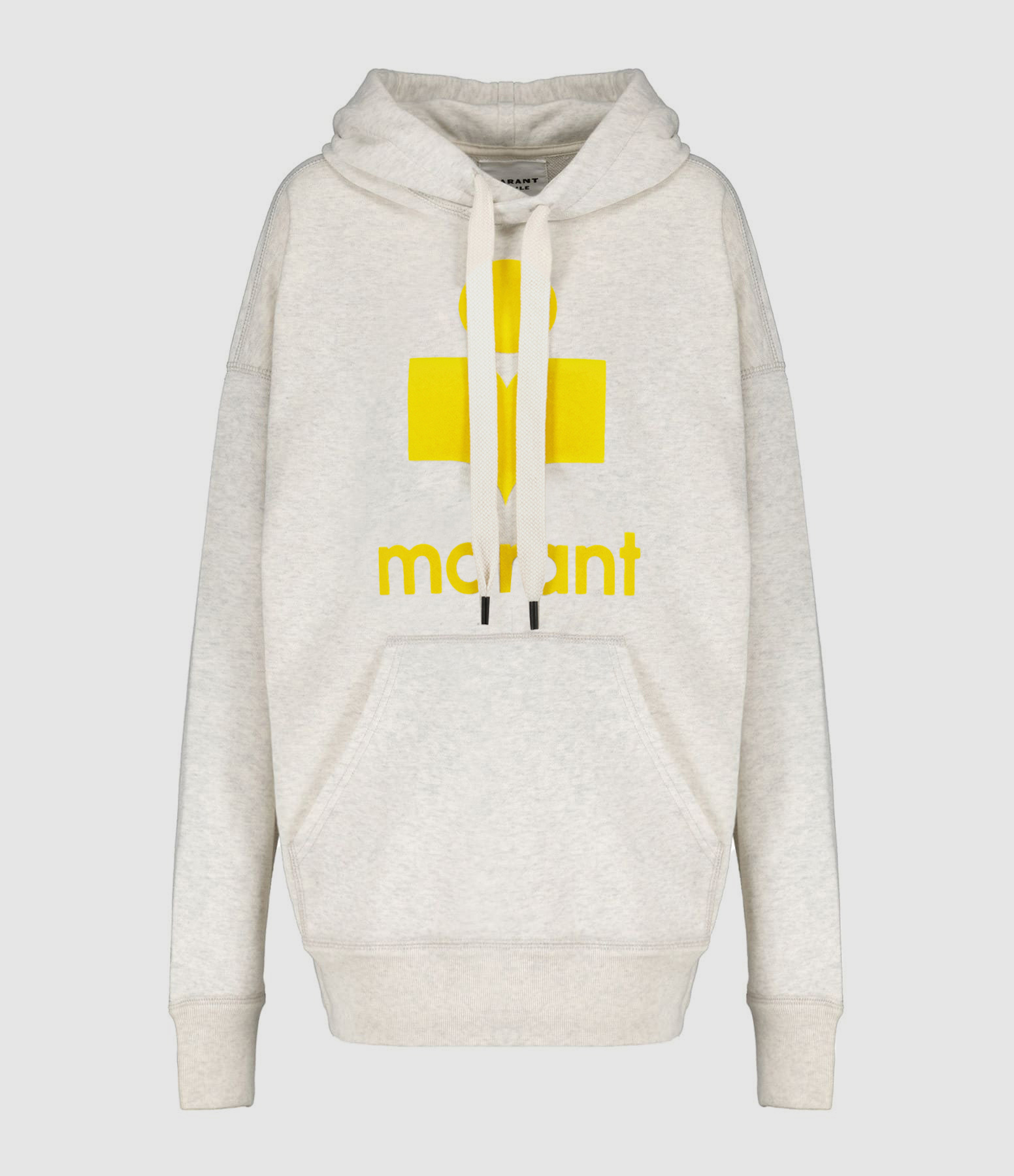 Sweatshirt en coton molletonné écru. Logo "Marant" en velours jaune sur le devant. Col rond à capuche avec liens de resserrage. Manches longues avec poignet côtelé. Poche kangourou sur le devant. Coupe ample. Base droite côtelée.