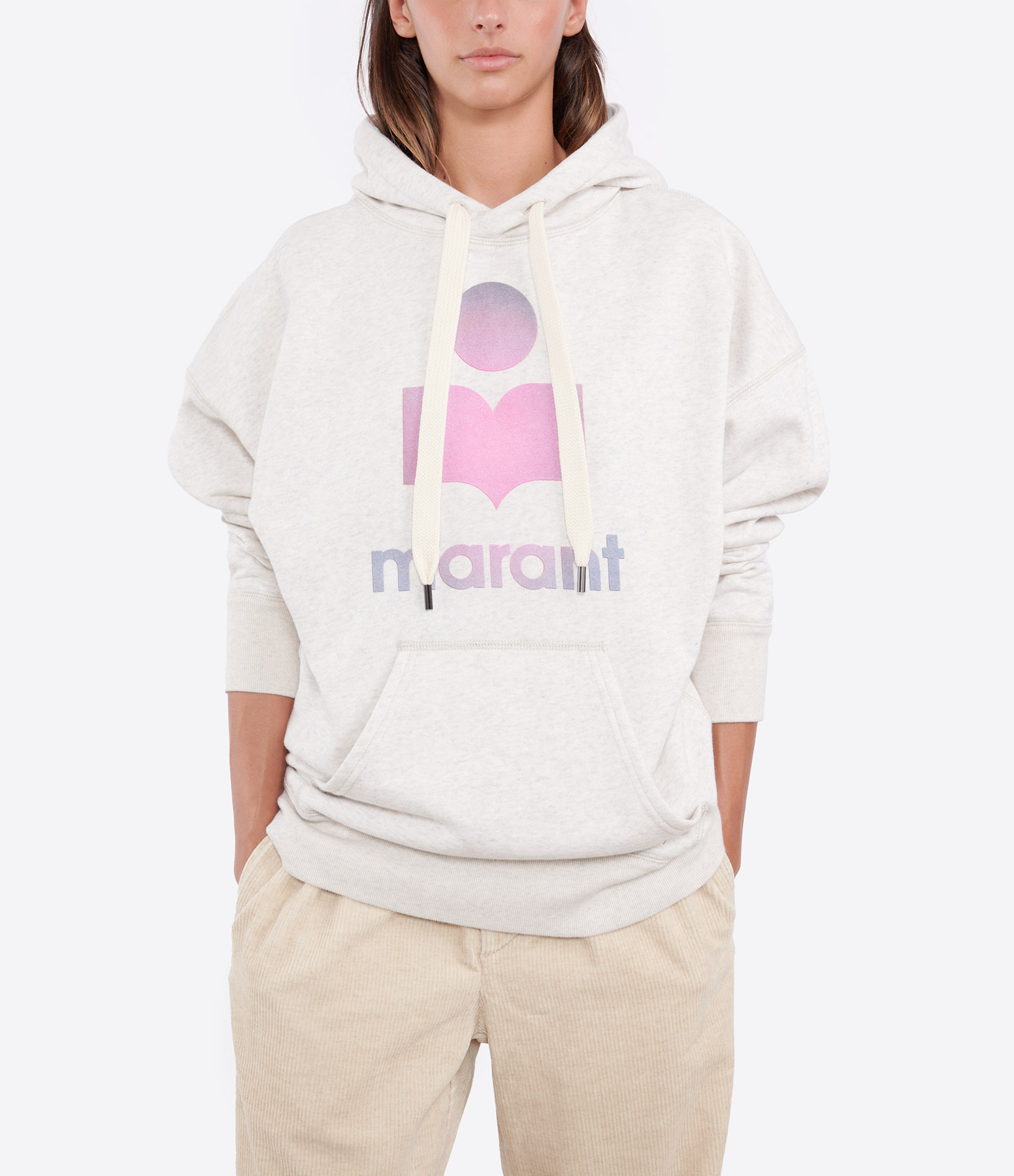 Sweatshirt en coton molletonné mélangé écru chiné avec le logo Marant flocké en velours rose et violet sur le devant. Col rond à capuche avec liens de serrage beiges. Manches longues avec poignets côtelés. Poche kangourou sur le devant. Coupe ample. Base droite côtelée.