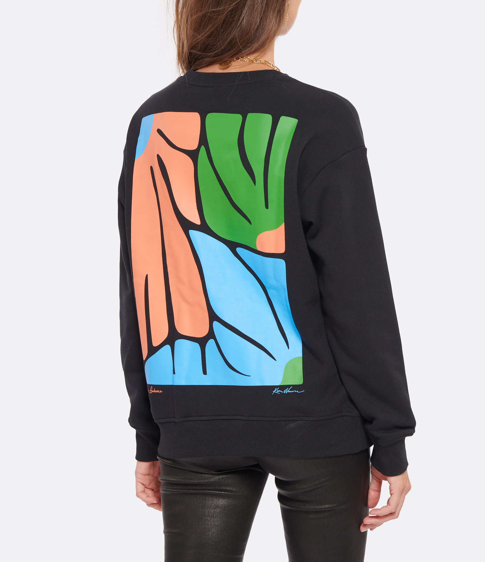 Sweat en coton noir. Logo au centre de la poitrine et motif floral abstrait au dos. Manches longues. Col ras du cou. Coupe oversize. Base droite.