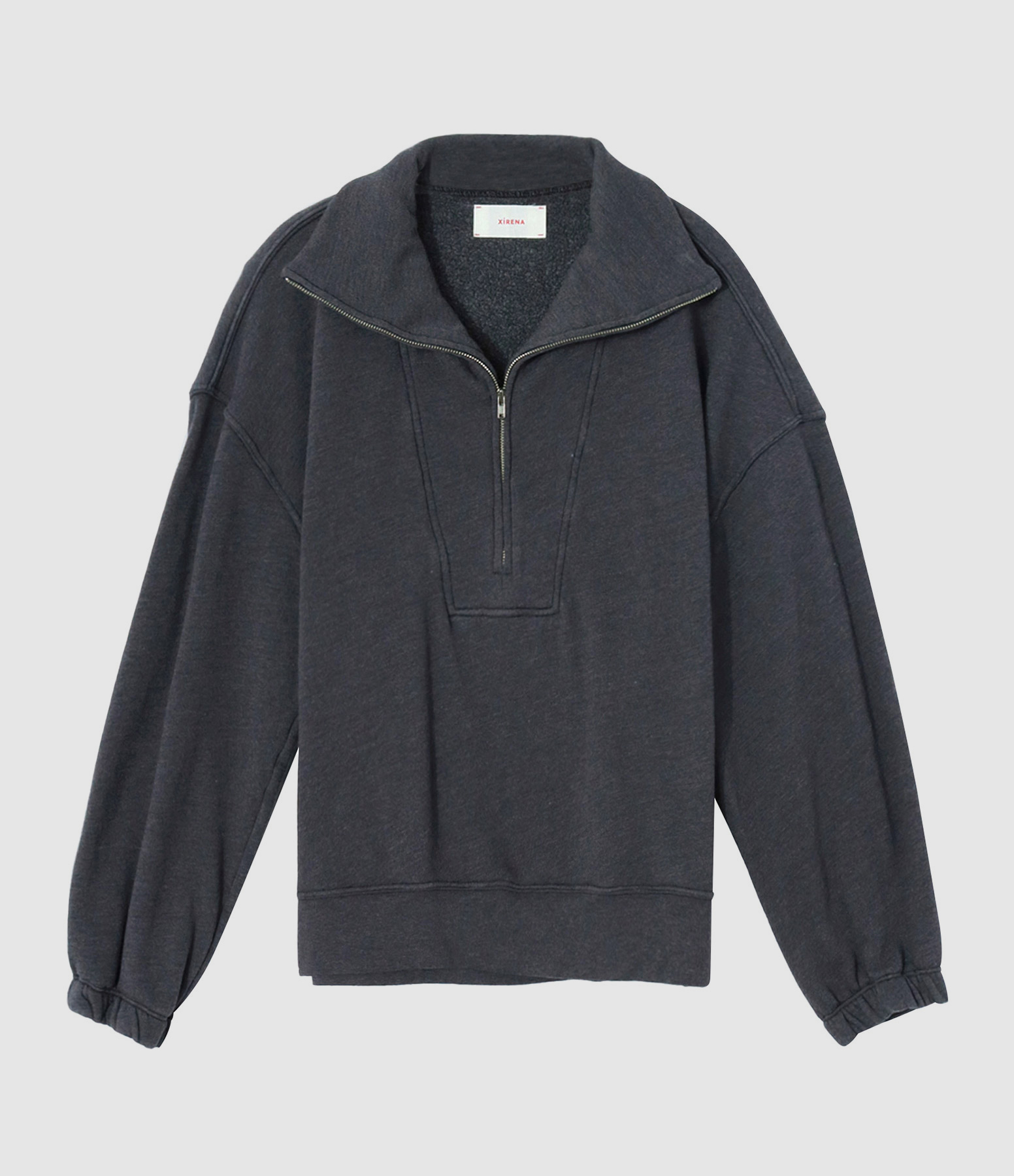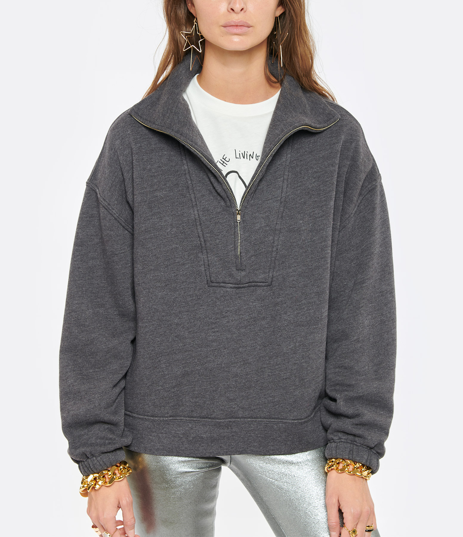 Sweatshirt en coton gris anthracite. Manches longues resserrées aux poignets. Col camionneur. Coupe droite. Base droite.
