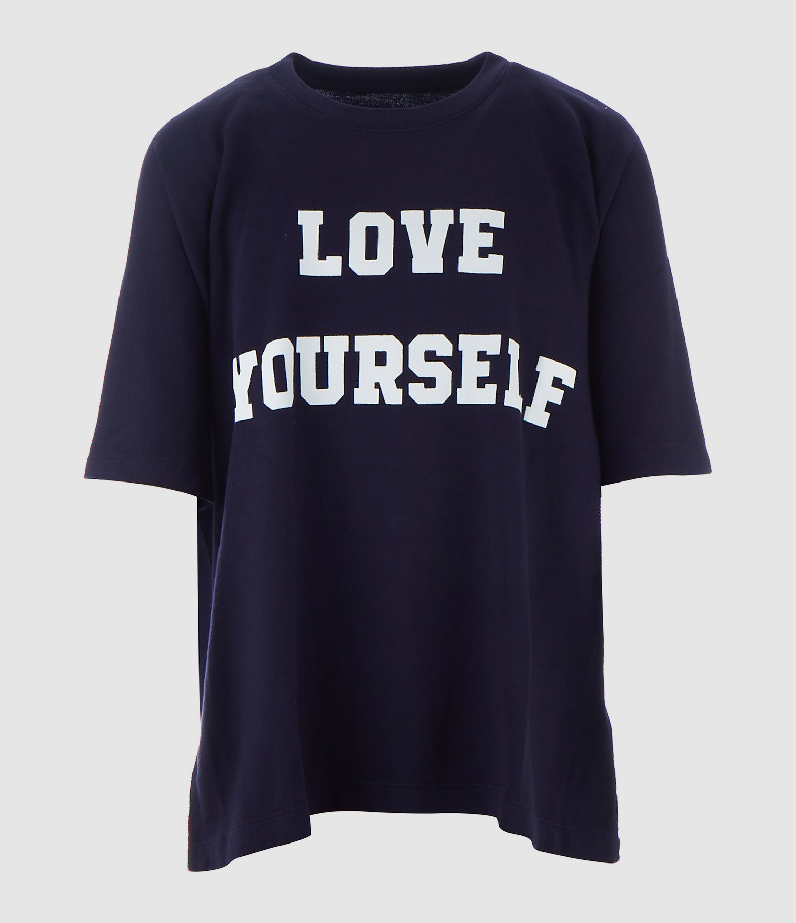 Sweatshirt en coton bleu marine avec inscription "Love Yourself" en blanc sur le devant. Manches courtes sans coutures. Col rond. Base droite. Coupe large.