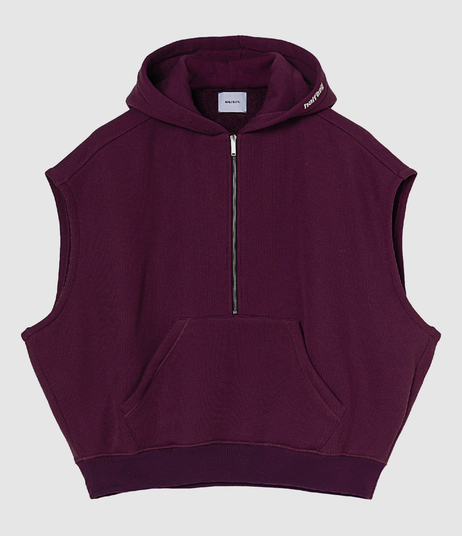 Sweatshirt à capuche sans manches en coton violet. Inscription "halfboy" sur la capuche. Col camionneur avec zip. Une poche à l'avant. Coupe ample. Base droite.