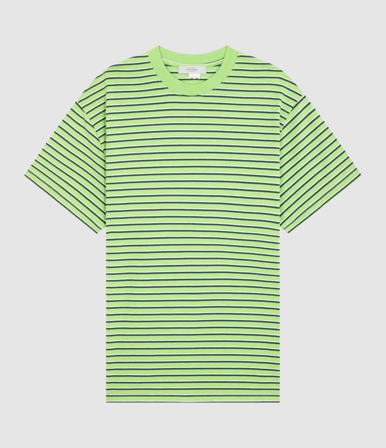 Ce tee-shirt oversize, à manches courtes, présente des rayures. Broderie RR discrète à l’arrière en dessous du col.