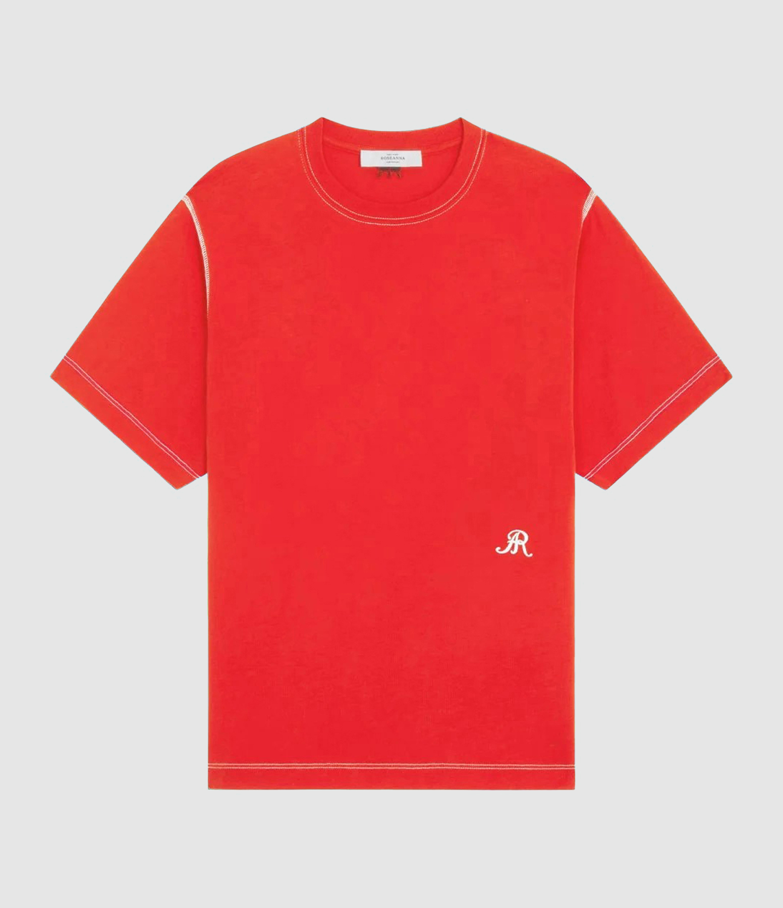 T-shirt en jersey de coton Roseanna, modèle JEROME. Coupe droite, manches courtes, col rond en bord-côte et présente des surpiqûres doubles aux emmanchures et à l’ourlet de couleur blancs. Une broderie AR calligraphique sur le corps apporte une touche signature.