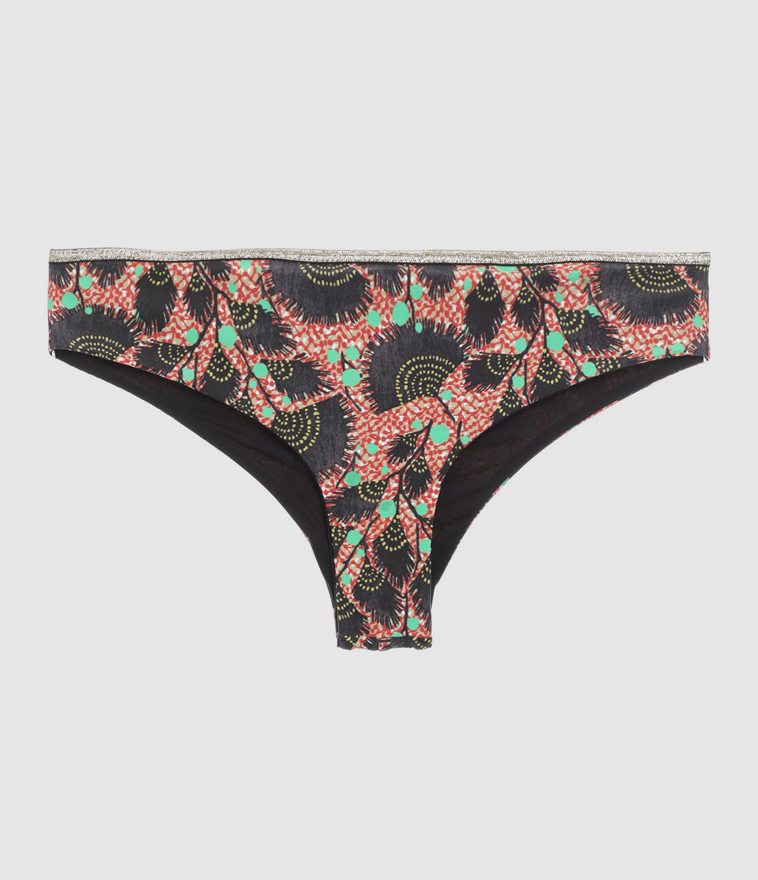 Culotte de bain à imprimé paon orné d'un liseré doré. Entièrement doublée et élastiquée pour assurer confort et maintien.