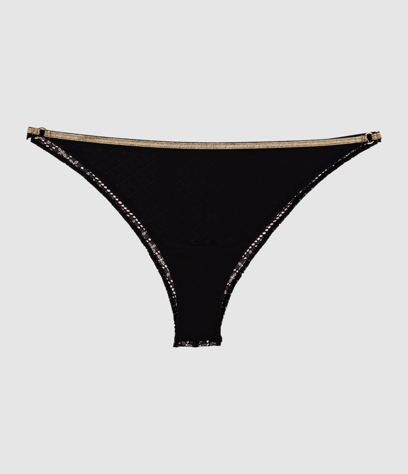 Tanga ajouré noir. Fond doublé. Entièrement élastiqué pour assurer un maximum de confort.