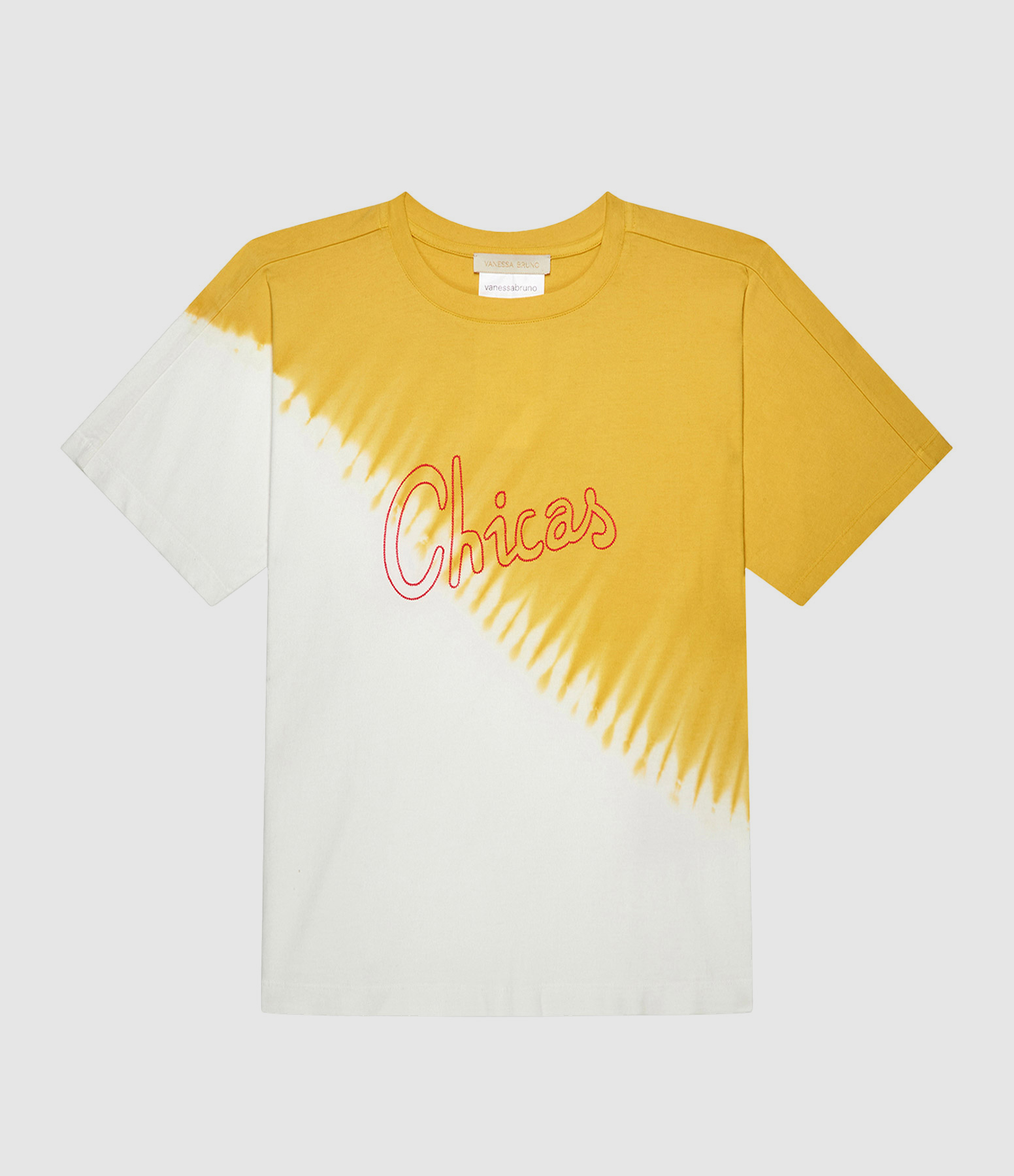 Tee-shirt jaune et blanc avec broderie rouge "Chicas" sur le devant. Manches courtes. Col rond. Coupe droite. Base droite.